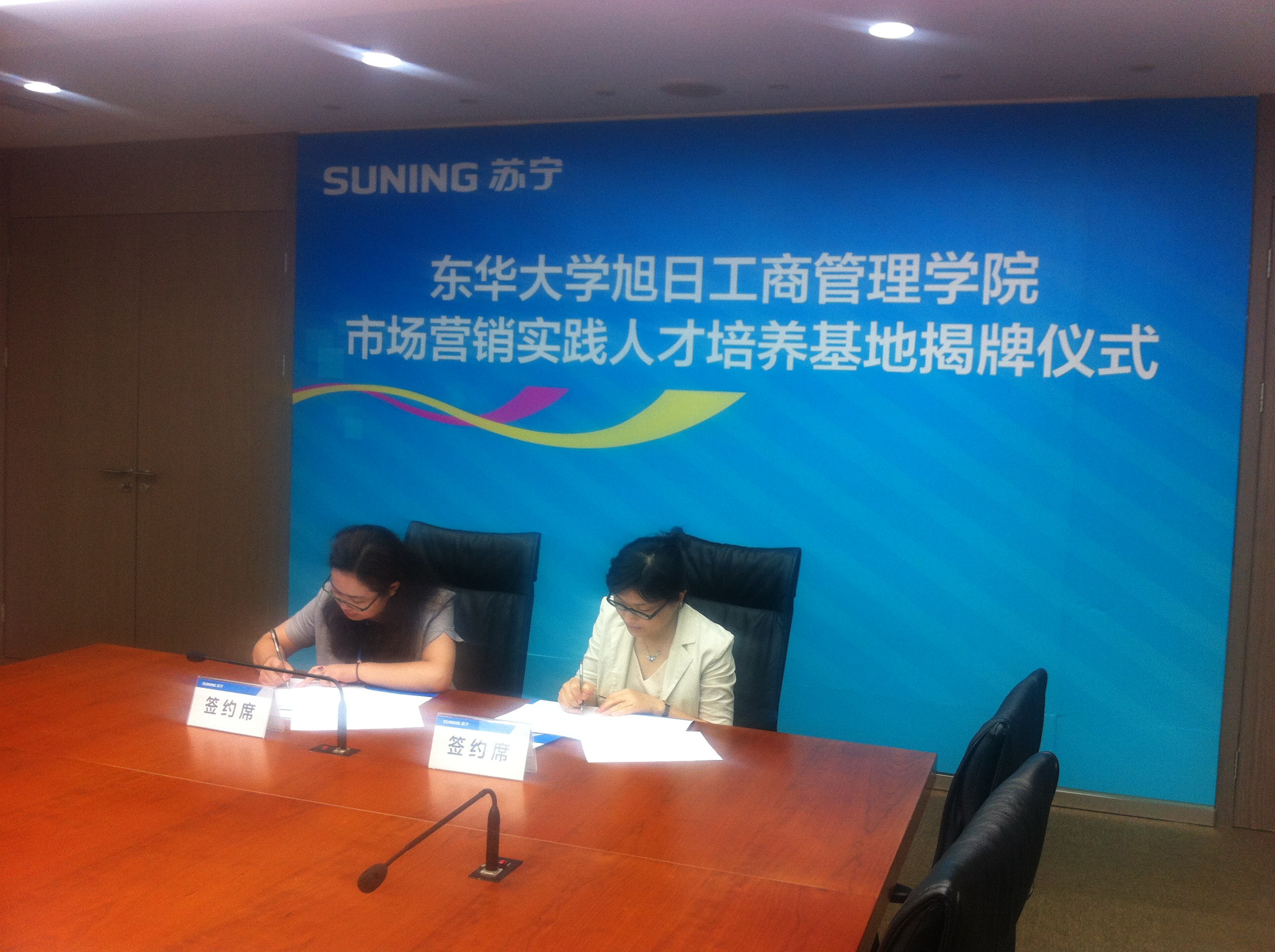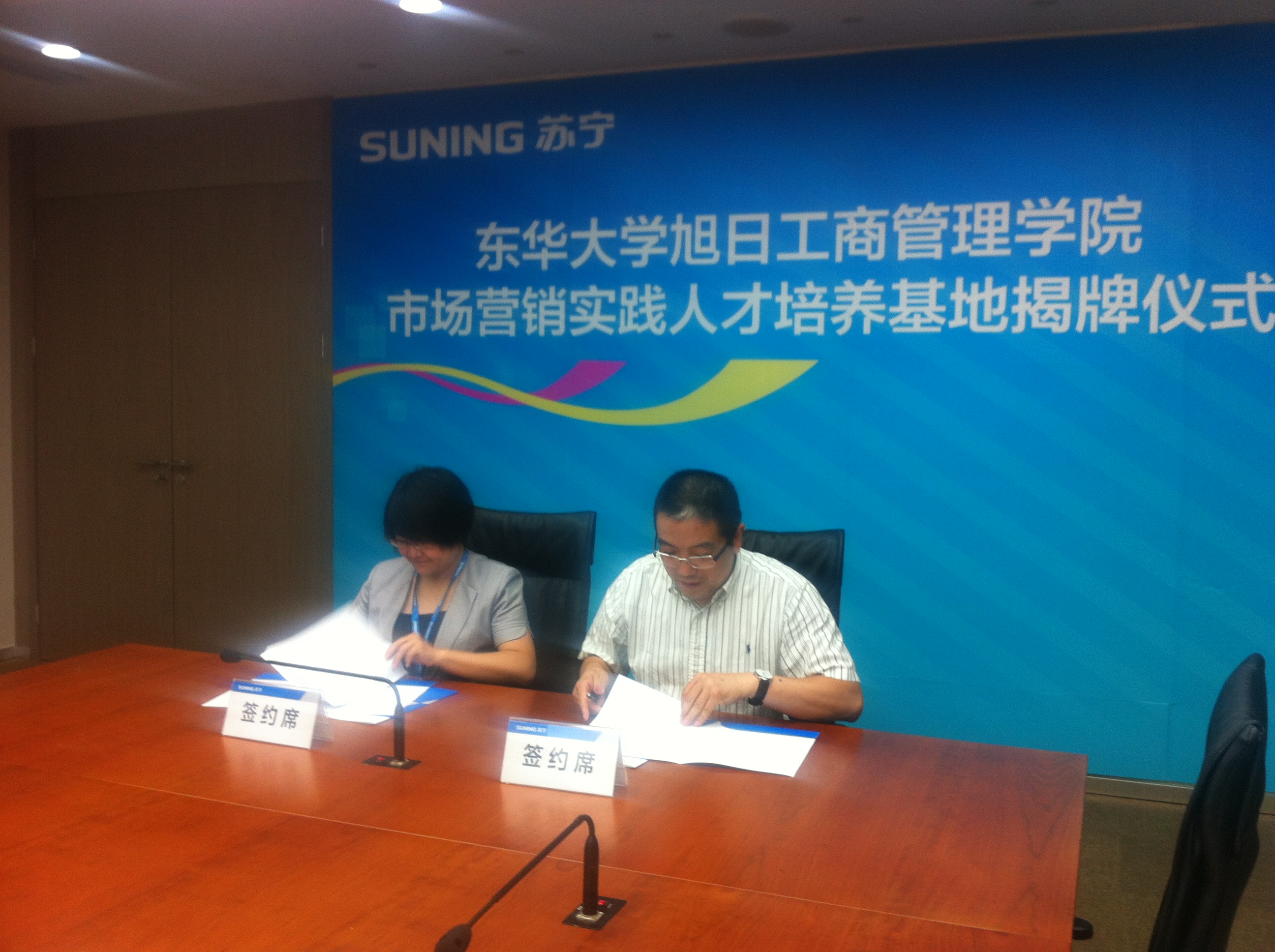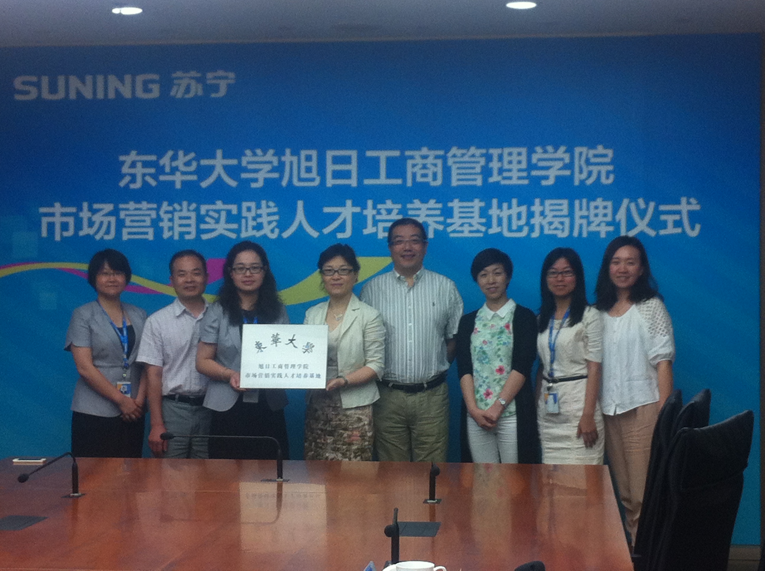 2013年7月17日,51视频 51视频 市场营销实践人才培养基地签约挂牌仪式在苏宁云商集团上海地区管理中心举行。51视频 副院长张科静、工商管理系主任刘东胜、副主任杨志勇、学生工作办公室江娥、高加加参加签约仪式,苏宁云商上海地区管理中心副总经理王鲲、人力资源总监王志英、人力资源部招聘经理周玲出席仪式。