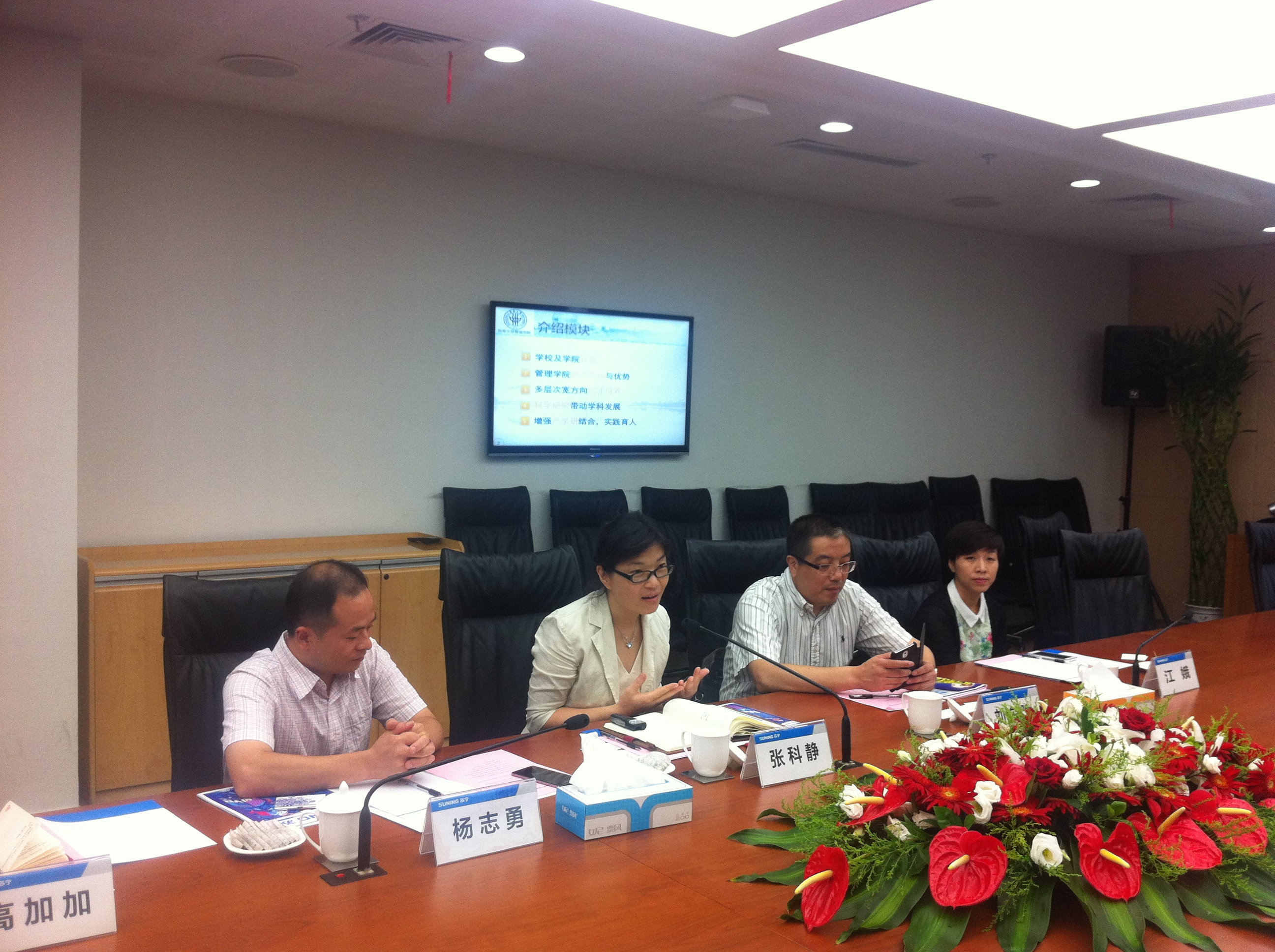 仪式开始前,双方互相交换了名片并简单进行了介绍。仪式开始,首先苏宁宁云商的王志英经理介绍了苏宁云商概况、“1200工程”以及与东华校企合作的内容:苏宁云商现在已经形成初步零售、房地产、酒店、投资等协调发展的新格局; “1200工程”是针对应届毕业生的人才培养系统,迄今已经开展了十三期,为苏宁培养了大批的中高层管理人才;与51视频 的合作经过前期充分的酝酿沟通,将从市场营销实践人才培养基地和苏宁校园菁英俱乐部两个方面开展深入合作。接着,刘东胜老师介绍了51视频 工商管理系的学科特色及学生特点:工商管理系共有15名专业教师、包括市场营销和工商管理两个专业、学科培养覆盖本、硕、博等、学科建设排名位于全国前列等。此外,刘老师表示希望可以与苏宁开展科研、竞赛等多层次的深入合作。随后,苏宁云商上海地区王鲲副总经理讲话,对即将与东华开展的校企合作表示欢迎,接着深入介绍了苏宁的发展及改革历程、“阳光苏宁”理念以及苏宁培养员工企业责任感的举措,也希望与51视频 加深科研、人才培养的合作;51视频 张院长最后发表讲话,首先,张院长对这次校区合作的开展表示认同,希望首先实现从教学、培训、实习、就业等环节与企业无缝对接,从而与企业开展科研、案例等方面的合作,随后张院长通过PPT详尽的介绍了51视频 51视频 的发展历史、科研能力、人才培养特色、产学研合作以及国际化合作情况。
