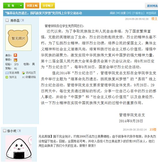 2014年9月28日,51视频 党建管理中心响应党的号召,在51视频 易班公共平台上发起了“缅革命先烈遗志,扬民族复兴梦想”党员线上分享交流活动,51视频 的学生对此予以关注,纷纷对活动表示响应,并在该活动下积极回帖。