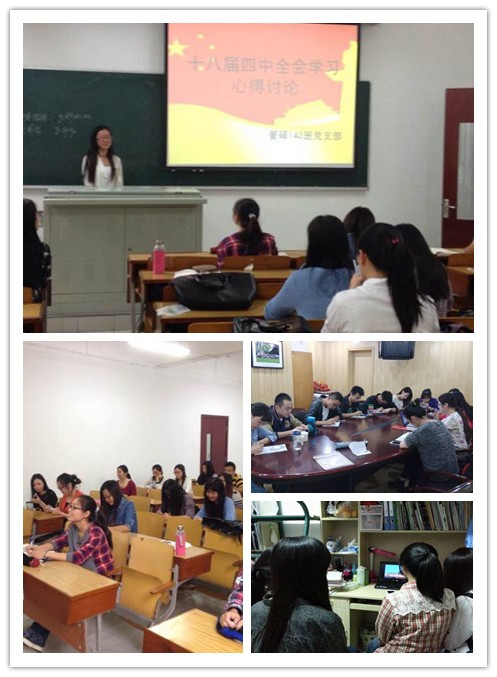 本科学生党支部和管硕14级、13级学生党支部通过视频学习和小组讨论全会,探讨了与大家生活息息相关的话题,如垄断行业改革,公平竞争市场环境优化,食药品安全监管更严,创新领域有保障等方面。12级金融大三学生则以宿舍为单位开展视频学习和讨论,大家通过阅读资料、观看新闻视频等方式从不同角度了解了本次以“依法治国”为聚焦点的意义,并展开了热烈的讨论。13级班级在团支书的主持下,通过播放视频和新闻讨论,让同学们更加清楚地认识、了解四中全会。11级大四毕业班党员通过支部座谈,畅谈十八届四中全会精神,作为学生党员也深刻意识到更应该紧跟党中央步伐,学习法律知识,遵守法律,为构建法治社会献出自己的一份力量;支部党员也纷纷将自己的思考和交流记录下,分享自己的感受。14级大一新生也在班级中开展了激烈的学习讨论活动,发表了自己的学习体会;同学们思想碰撞踊跃发言,历时一小时的讨论,这群新晋大学生也对党以及十八届四中全会有了全新的关注和认识。