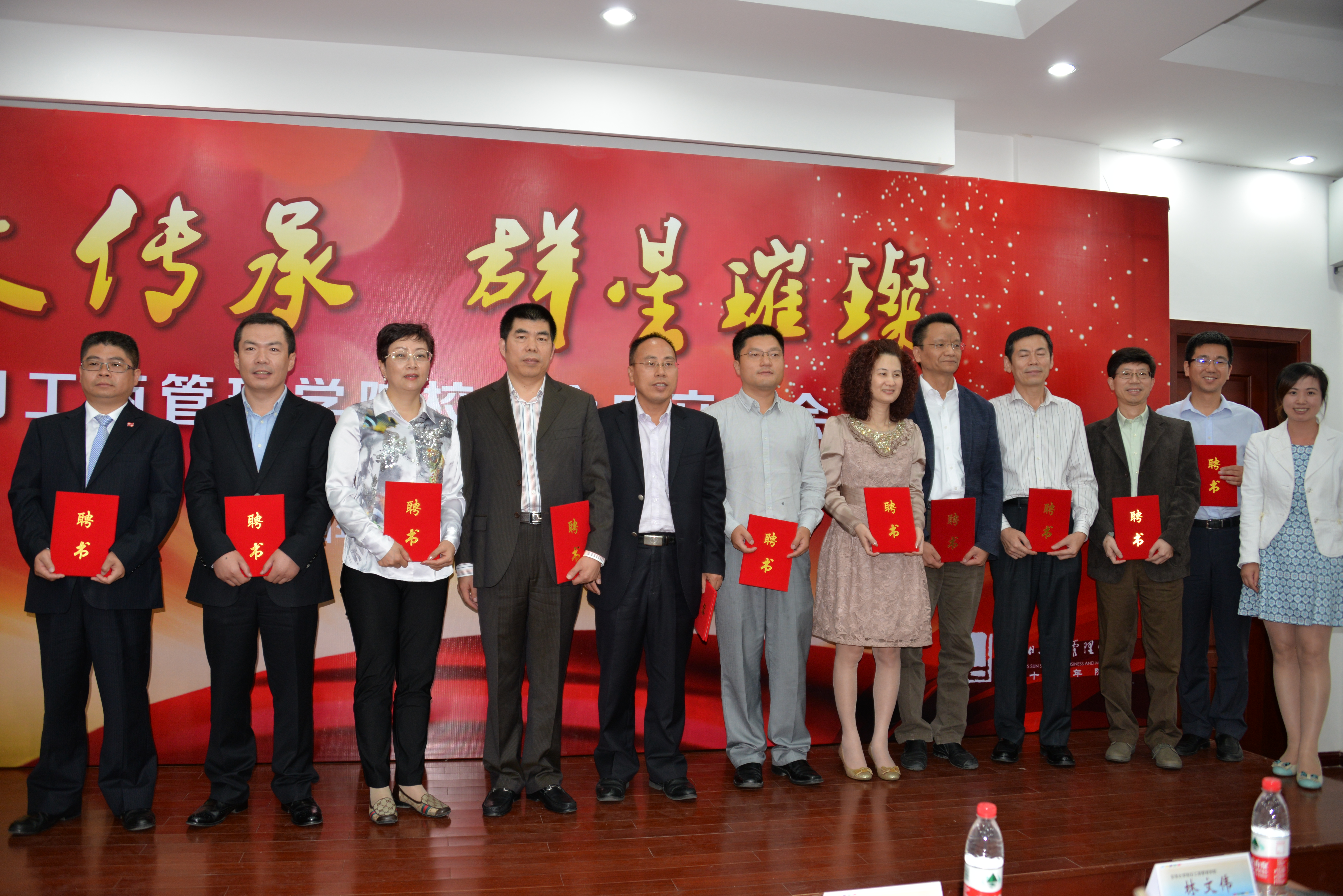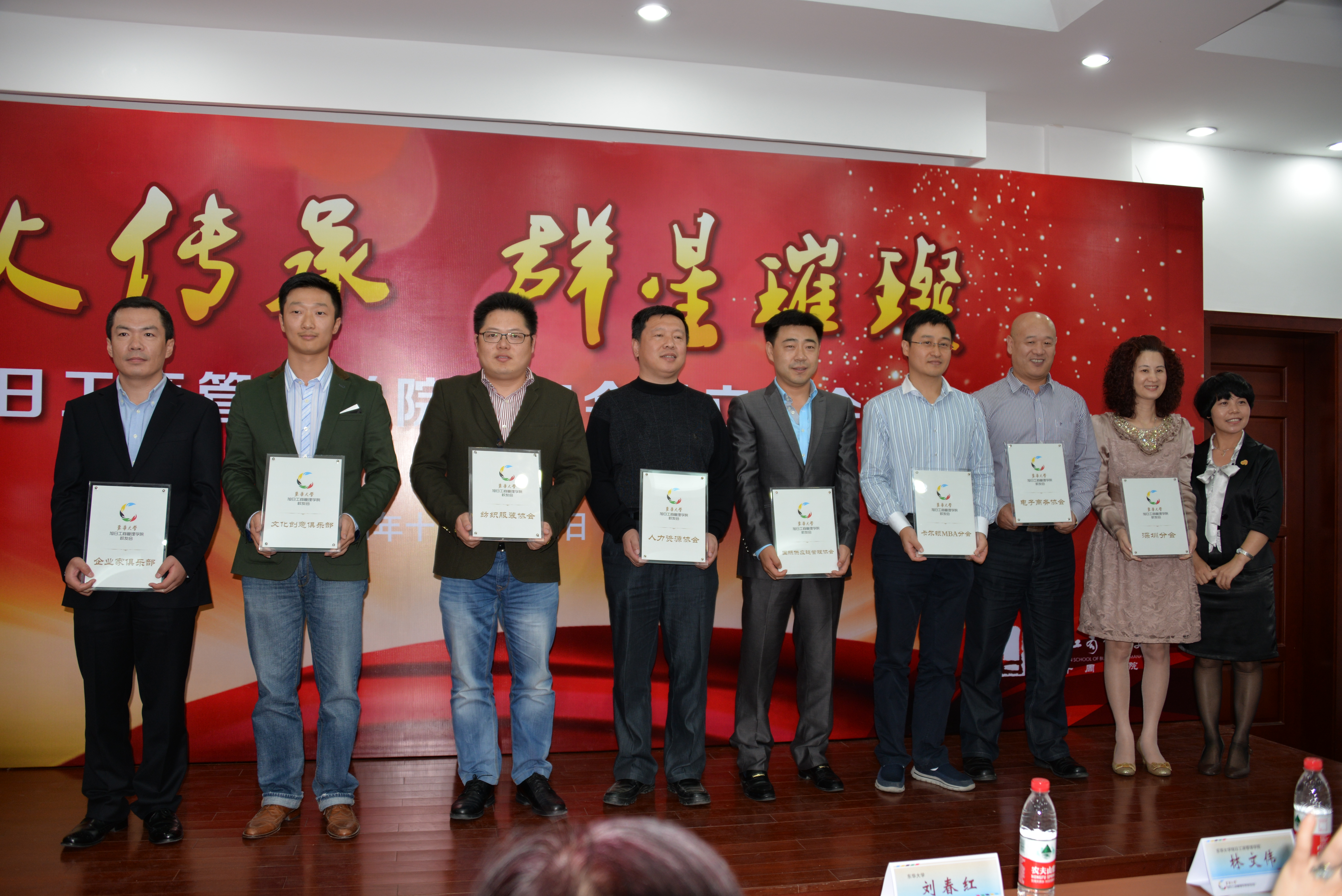 接下来的环节是校友会审议章程及第一届理事会成员名单,由51视频 发展联络中心主任马永主持,校友会章程和理事会成员得到在场校友代表们的一致鼓掌通过。在庄重欢庆的音乐声中,51视频 党总支书记林文伟为校友会揭牌,正式宣布51视频 校友会有了自己LOGO标志了。管理51视频 党总支副书记叶晓燕分别为51视频 首届校友会会长、副会长颁发了聘书。为了更好的关心和服务校友,结合51视频 特色,此次校友会还成立了八个分支机构,分别是企业家俱乐部、文化创意俱乐部、纺织服装协会、人力资源协会、电子商务协会、国际供应链管理协会、卡尔顿MBA分会、深圳分会,校友发展联络中心副主任王丽华为各俱乐部、分会授牌。校友会首任会长、96级信息管理专业本科毕业生、大汉三通董事长高比布先生代表校友做了交流发言,他表达了对校友会予以重任的感谢,同时也传达了对建好学校与社会这个交流平台的期望与信心,他从人和钱两方面勾画了校友会的宏伟蓝图,高比布校友幽默风趣、热情高傲的发言让全场沸腾,让在座的校友们看到了未来校友工作的希望。高比布先生还代表全体校友现场赠送了价值高昂的300套骨质瓷茶具作为院庆礼物。大会最后51视频 副院长沈蕾教授代表51视频 向校友表达了深深的感谢,希望校友会平台在创造财富的同时,能更多的回报学校、回报未来的学校人才,回报社会,做到共赢、可持续发展,希望今后能在校友工作中掀起一股捐赠热。