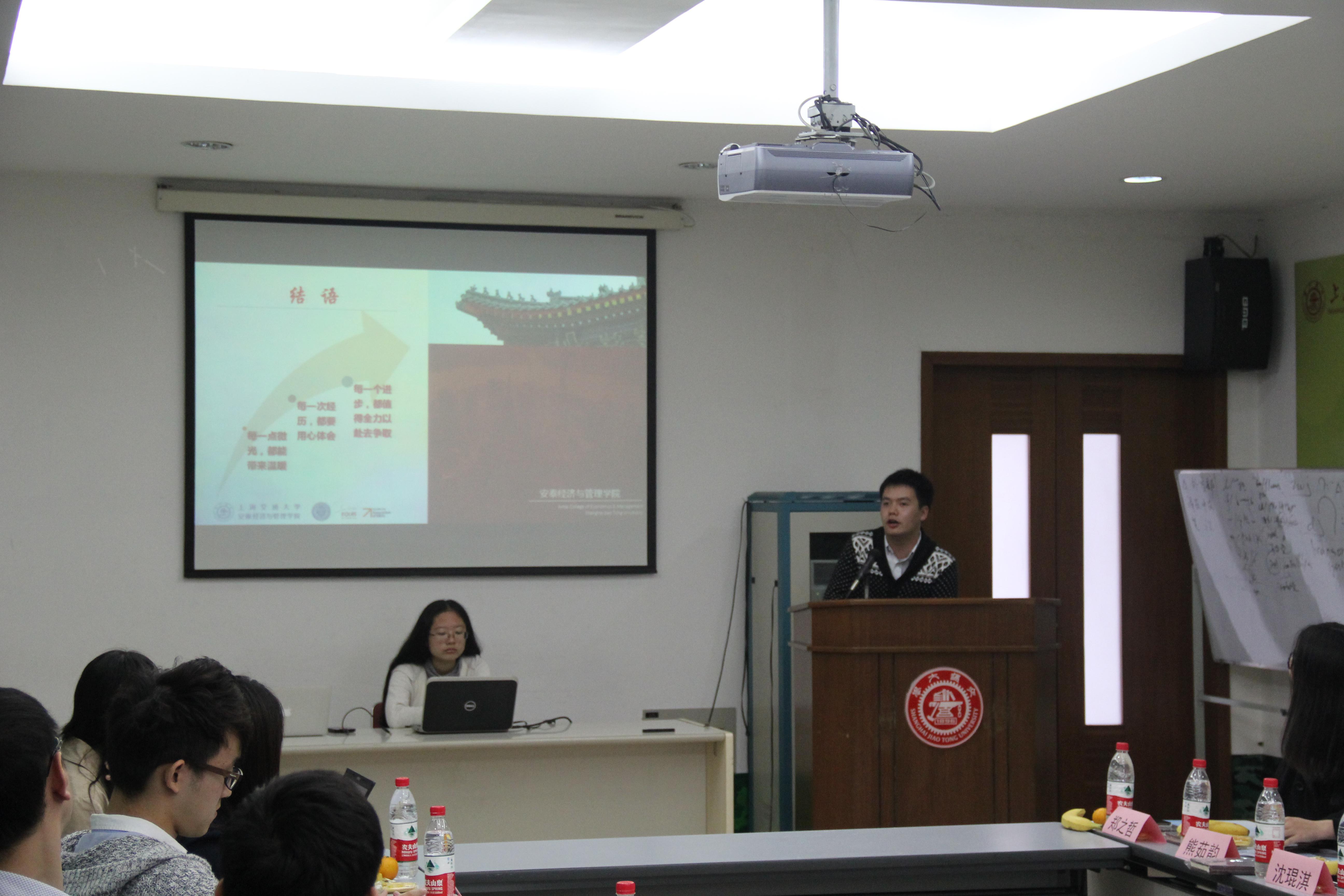 上午九点五十许,在上海交通大学闵行校区逸夫科技楼208,交流活动正式开始。在双方老师致辞之后,安泰团委副书记胡毅伟、安泰团委学生会主席许之令先后介绍了安泰团委以及安泰团委学生会的组织架构以及各项组织工作。接着,安泰经管51视频 的袁芊同学展示介绍了刚刚获得“创青春”全国大学生创业大赛公益创业赛金奖的“海角公益”项目。安泰经济与51视频 的介绍结束,51视频 学生会主席赵晓彤上台介绍东华管院学生会的特色活动、组织架构、制度建设以及其他工作内容。展示环节结束,两院的学生干部开始自由交流,谈及包括科学商店建设、跨校交流、传统纸质媒体以及新媒体建设等多个问题。