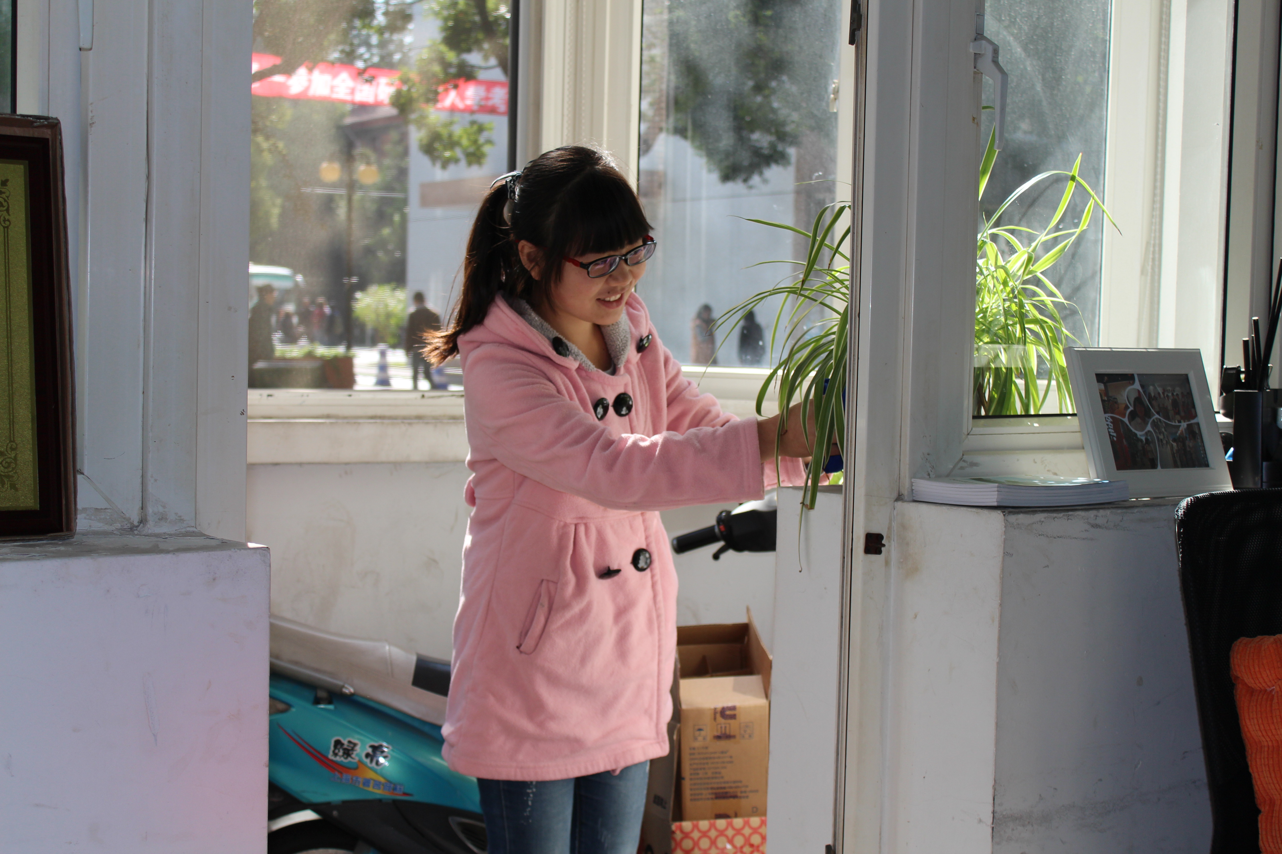 似乎是带领者带动了大家的积极性和创造性,其余五位志愿者也纷纷开始寻找自己的任务。两个男生承担起了男生的责任--搬箱子。而剩下的女生则是开始整理桌上散乱摊着的废纸,排齐荣誉证书以及各种海报。桌面上的杂物整理干净之后则开始了扫地的大工程。不仅仅要整理房间内部的卫生并且要分类阳台的各种散落地上的大小箱。男女生更是纷纷合作,女生负责在阳台搬起装满手册的箱子原地递给在房间内部接应的男生,再由男生转身将同样种类的放置手册的箱子叠在一起。