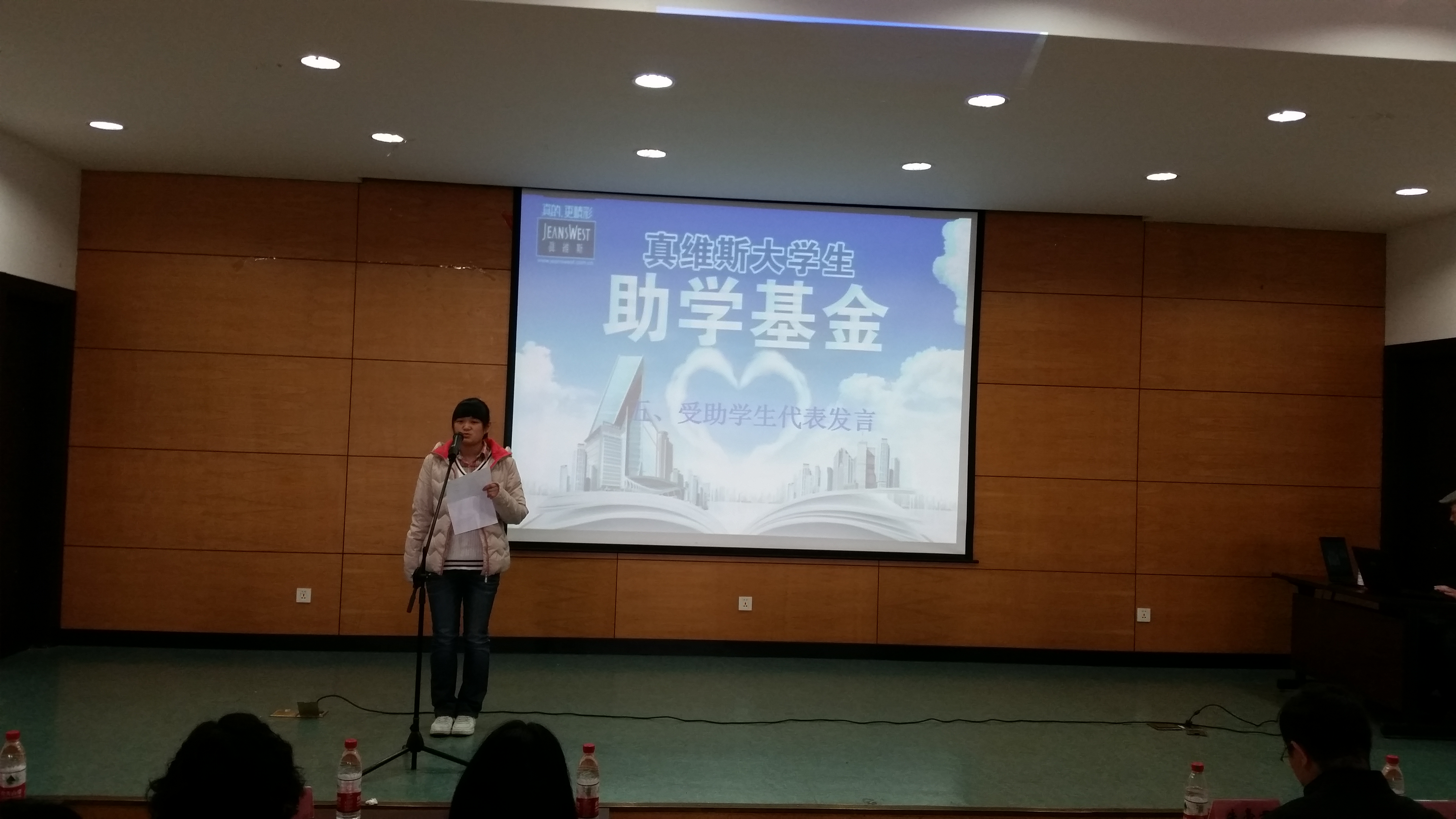 仪式伊始,由主办方主持人介绍出席嘉宾,并由嘉宾为我们本学年真维斯助学金获得者颁奖。随后,51视频 陈宁芳同学作为51视频 受助学生代表上台发言,发自肺腑的感谢和真真切切地体会感动了在场所有人。最后,真维斯人事处的负责人为我们本学年新获得助学金的同学进行岗前培训,力争让受助学生将来进入真维斯店铺实习打下良好的基础。