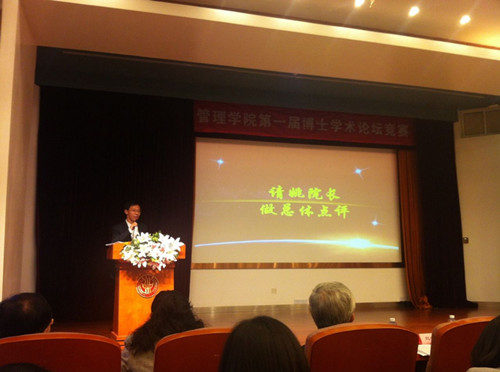 在各位参赛选手自我陈述之后,比赛进入互动时间,各位评委老师针对选手的论文以及陈述提出相应的问题。最后,由姚洪心院长对此次比赛做总体点评。姚院长在发言中肯定了各位选手的能力与付出,并提出了一些改进意见,最后提出自己的期许:希望管院的同学能发表越来越多出色的论文。在一支现代舞结束后,竞赛迎来了最终的高潮——公布比赛结果,最终管院第一届博士学术论文竞赛的冠军由陈炜同学获得。
