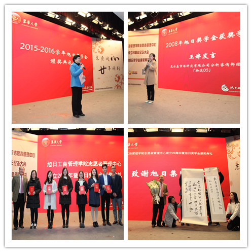 大会还进行了旭日奖学金颁奖典礼。旭日奖学金风采视频回顾中,我们了解到从2003年开始,旭日集团每年捐资5万元设立旭日奖学金特等奖1位、一等奖5位表彰优秀的管院精英,如今他们已成长为社会的栋梁之才。尼尔森市场研究有限公司分析咨询部经理王婷(2008年旭日奖学金获奖者、物流)代表获奖学子感谢学校、51视频 的培养和旭日集团的激励。随后,管院学子代表给香港旭日集团华东区副总经理冯庆崧先生献上了致谢旭日集团和杨勋先生的纪念奖杯和学生书法作品,冯庆崧先生也代表旭日集团接受了学生的采访。