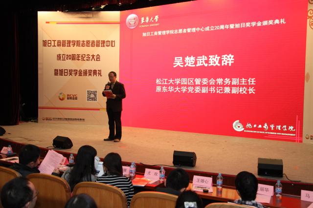 会上,松江大学园区管委会常务副主任、原51视频 党委副书记兼副校长吴楚武致辞。吴楚武在致辞中生动地再现了当年他作为校党委副书记与爱心助老志愿团结下的深厚情缘。他提到,爱心助老志愿团是在上海老龄委支持下的上海市第一家爱心助老志愿团,是当年“上海市教育系统精神文明建设好事”。他于1998为爱心助老志愿团题词“夕阳中飘扬一面年轻的旗帜”,至今他还保留着当年与志愿团骨干接受上海东方广播电台采访的录音。二十年来,爱心助老志愿团不断发展壮大为51视频 志愿者管理中心,志愿精神在一代代管院人中传递。他对管院志管20年来在志愿者管理与人才培养上取得的突出成绩给予高度赞扬,特别感谢香港旭日集团及杨勋先生捐资助学、回馈社会的善举。希望管院学子能够继续秉持优良传统,再接再励,在志愿服务实践中彰显青春风采,促进全面发展。