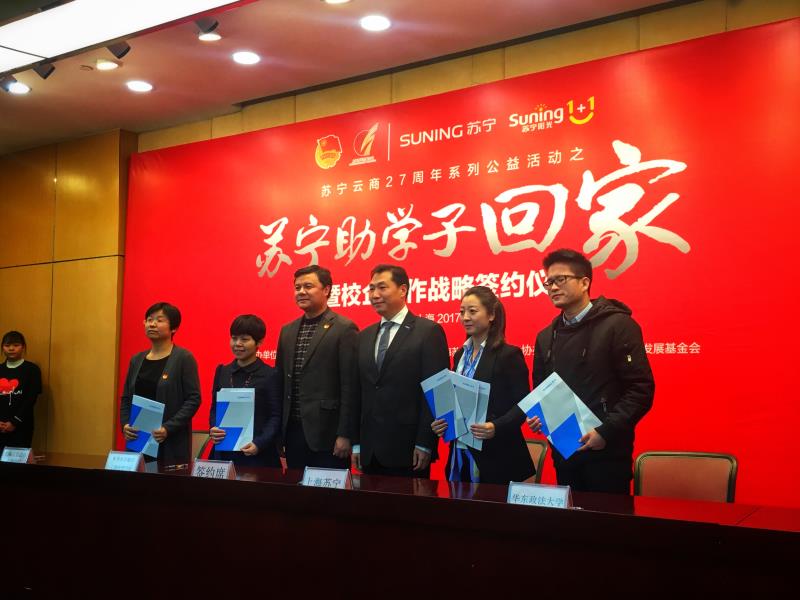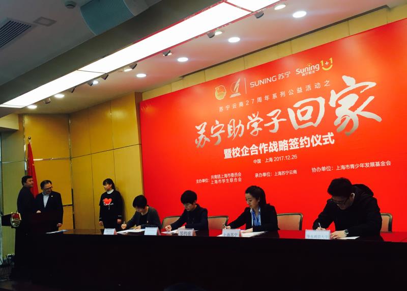 据悉,2013年-2016年,上海苏宁联手共青团上海市委员会致力资学助教领域公益活动,打造“送贫寒学子回家”公益项目,苏宁每年捐赠50万元给予贫寒学子,受助学子逾3000名,受助学子多达20多个省份,涉及40多所高校。目前沪上已有复旦、交大、同济、财大、东华等9所高校参与了团市委与苏宁的该项公益活动。今年,我校51视频 首次与苏宁云商开展涵盖“送贫寒学子回家”公益项目的“一揽子”战略合作计划。