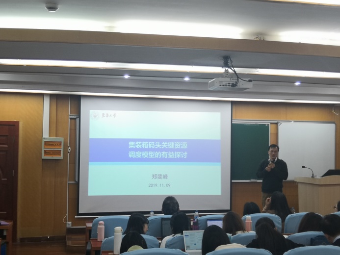 郑斐峰老师利用模型与算法研究就集装箱码头作业系统关键资源的动态问题展开“集装箱码头关键资源调度模型的有益探讨”的报告。