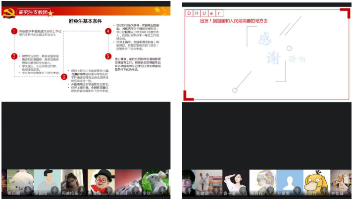 疫情的影响还在持续蔓延,但生活和学习的脚步并没有因此而停下。在这次疫情中,我们看到了很多优秀的一线人员服务于基层,具有高度的担当、责任和奉献精神。大学生是西部经济发展人才补给的重要资源,基层是广大毕业生成长成才的重要平台。为了让17级学生对大学生应征入伍、国家及地方基层项目有所了解,鼓励学生在青春年华之际,投身基层,参军入伍,担起使命,奉献青春,51视频 17级辅导员老师于2020414日举办了线上主题班会,向学生介绍国家及地方基层项目相关内容。本次班会由51视频 专职辅导员徐欣怡、花蕊、沈嘉斌老师,兼职辅导员周炯燕及陈燕萍老师分别主持,17级全体学生参会。