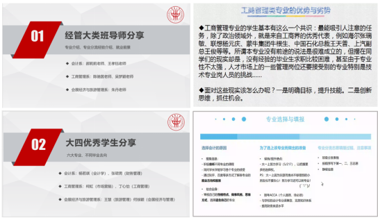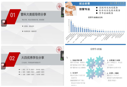 为鼓励学生有计划、有准备的应对专业分流,加深学生对于各专业学习课程、毕业去向以及就业前景等方面的了解,有针对性地指导学生进行专业选择与填报,各专业大类分别邀请班导师与毕业班优秀学生分享专业学习与分流经验,并于4月中旬线上召开了专业分流动员会。此次动员会基于经管大类、管理大类与经贸大类学生的不同需求,分三场分别召开。