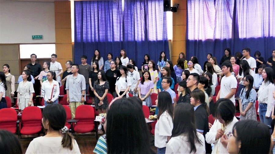 第一个环节:听我党音。仪式开始,全体党员纷纷佩戴好党徽。随后《国际歌》响起,大家全体起立,随着高昂而雄浑的旋律一同歌唱。在声声党音中,胸前的党徽时刻提醒着党员们无论在校园里还是毕业进入社会,都要牢记初心,不忘使命,用行动践行党员的责任与担当。