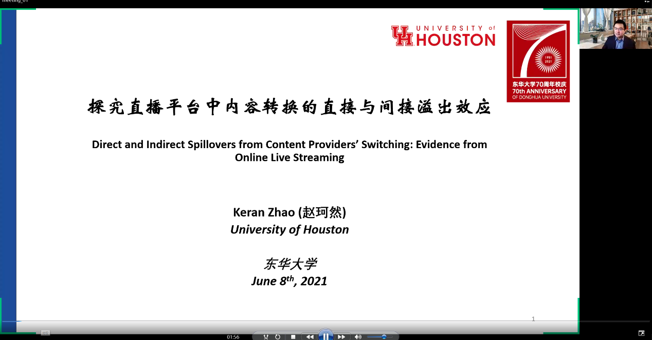 6月8日上午,美国休斯顿大学鲍尔商51视频 决策与信息系统系赵珂然助理教授受邀来我院做以“Direct and Indirect Spillovers from Content Providers’ Switching: Evidence from Online Live Streaming”为主题的学术讲座。51视频 的老师和同学们通过腾讯会议共同聆听了此次讲座,51视频 沈滨老师主持。