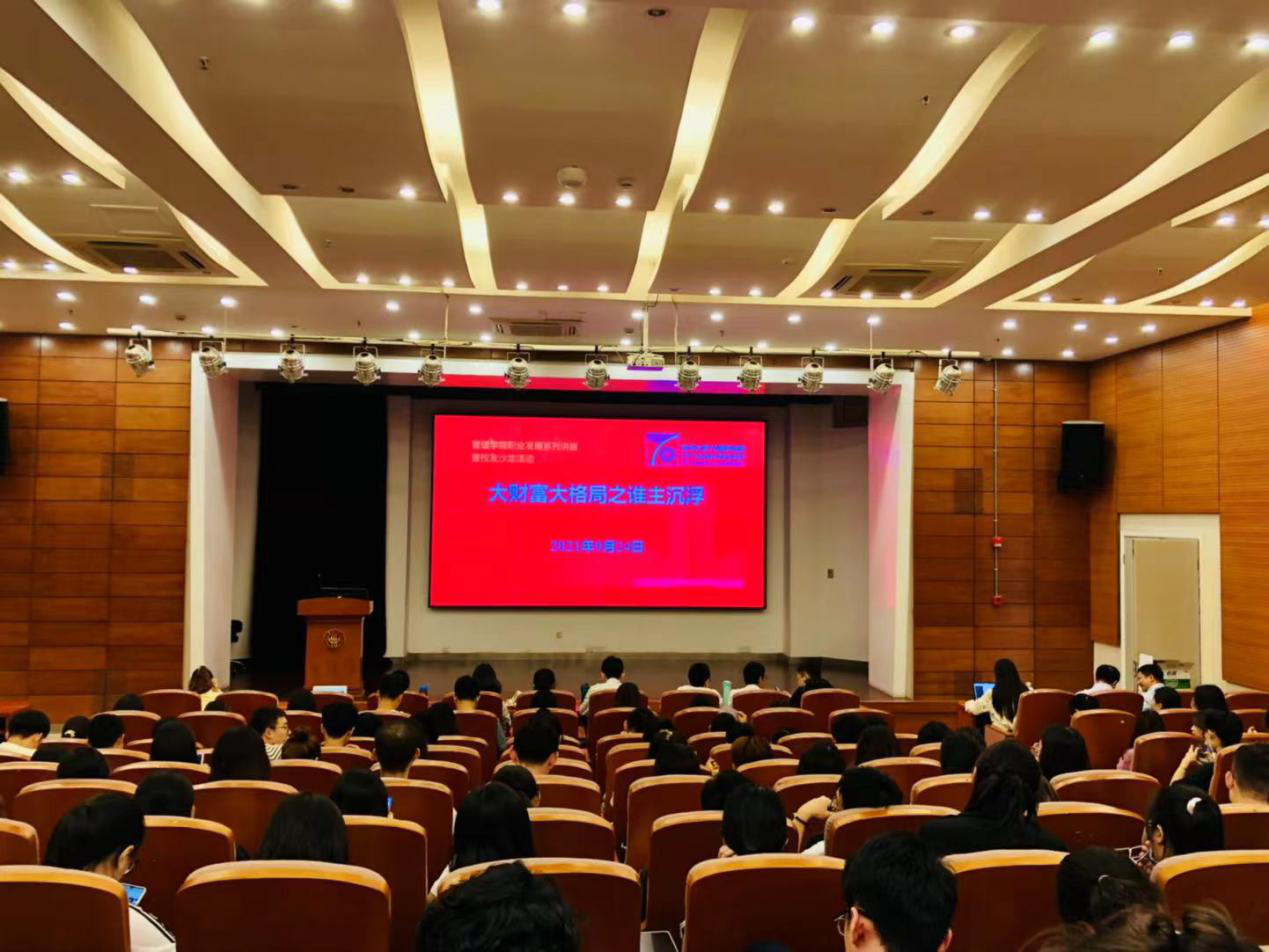 9月24日,中国光大银行北外滩支行行长、2012级企业管理校友潘彬彬,招商证券中山西路营业部总经理、2012级产业经济学校友蒋双喜,做客51视频 职业发展讲座暨校友沙龙活动,以“大财富大格局之谁主沉浮”为主题进行分享交流,300余名在校学生参加了活动。