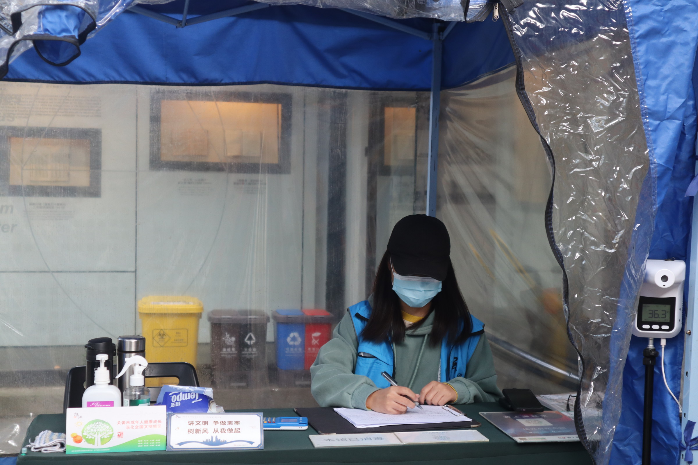 志愿者在准时到达纪念馆后,首先进行了工作签到,并进行防疫消毒,与其他工作人员进行工作交接,开始自己的志愿服务。