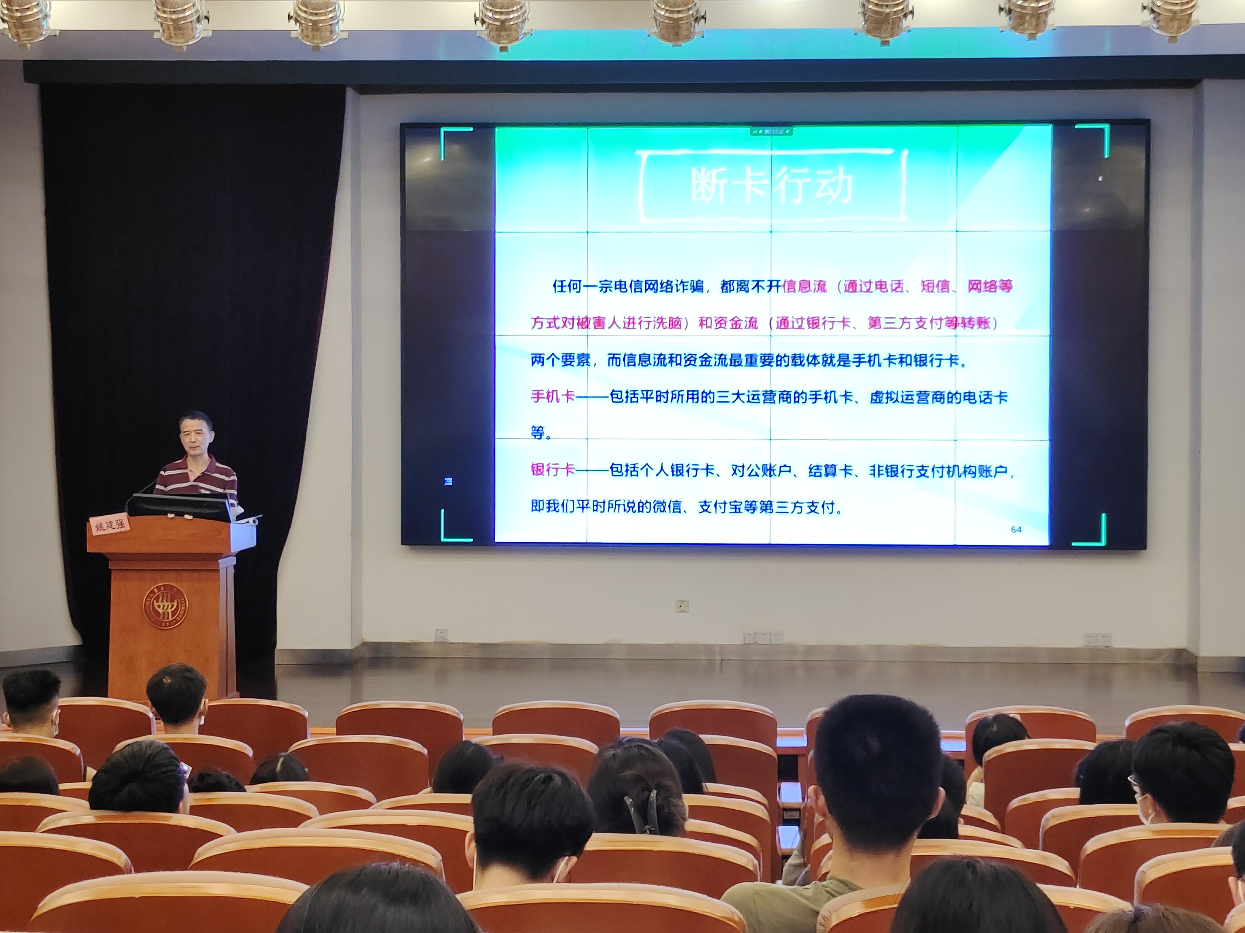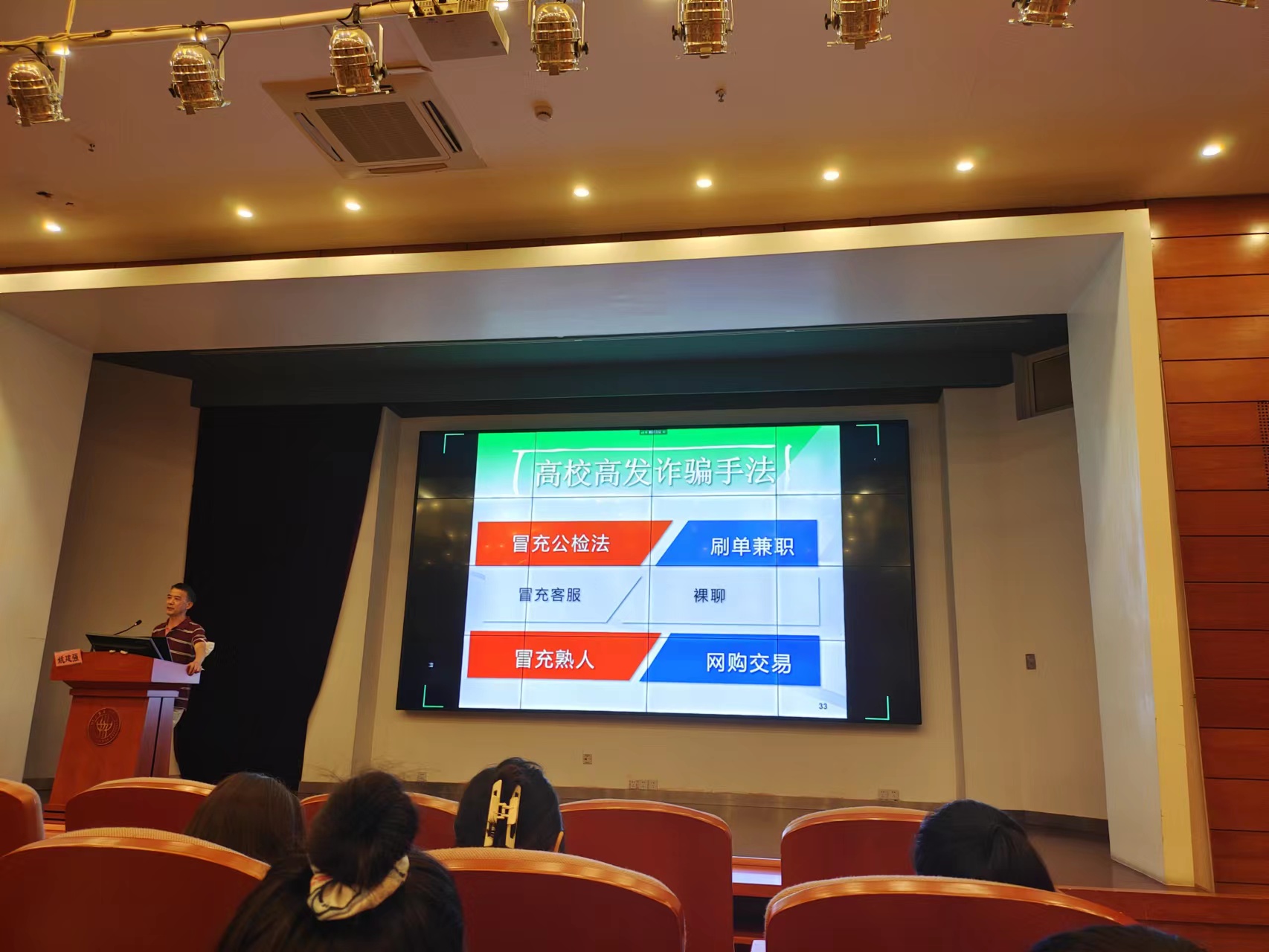 姚建强重点强调财产安全,详细讲解高校高发的典型诈骗手法,并结合真实案例,通过各类被骗经历,凝练出该类案件代表性特征关键词,总结出六个“一律”、十个“凡是”和反诈骗灵魂八问来加强学生防诈骗意识,倡导学生文明上网、绿色上网,做到不轻信、不转帐、不汇款,进而保护学生的人身和财产安全。