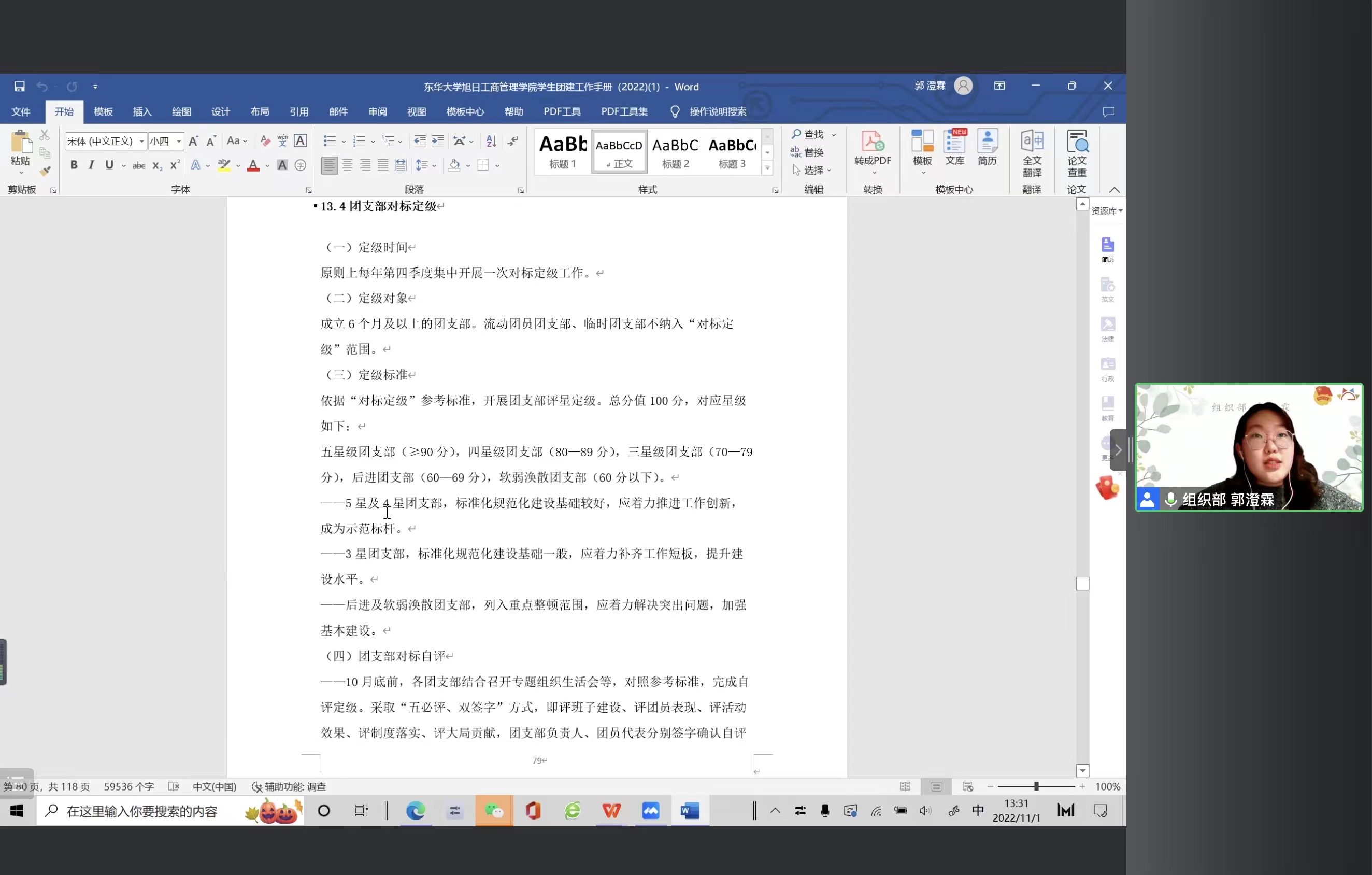 分享会还邀请了优秀团支书代表财务2101吕蕙宁进行经验分享,她结合自己过去一年的工作,重点围绕青年大学习、主题团日、大型活动组织、团员管理等展开,分享了自己在工作中的一些经验。同时,她提到了怎么干好团支书的工作,要学会利用办公小程序,学会分配任务,提高办事效率与质量,把握时间节点,也在工作中收获了责任的力量与集体的幸福感。