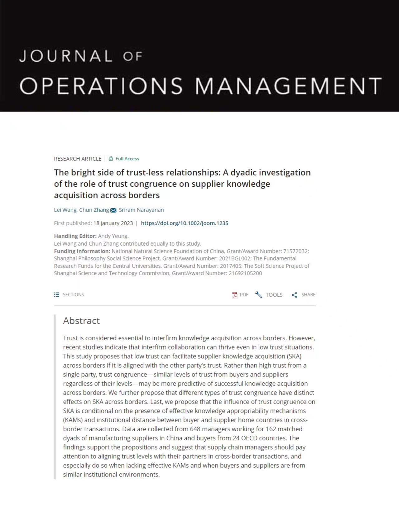 近日,我院应用经济系王雷教授以第一作者的身份在国际顶级学术期刊《Journal of Operations Management 》上发表了学术文章《The bright side of trust-less relationshipsA dyadic investigation of the role of trustcongruence on supplier knowledgeacquisition across borders》(《不信任的光明面:信任一致性对跨境知识获取的影响》)。该杂志是美国德克萨斯大学达拉斯分校(University of Texas at Dallas)所选出的商51视频 最顶尖24本学术期刊(简称“UTD-24”)之一,也是英国商51视频 协会(简称“ABS”)评选出的4星级期刊(级别最高)和英国金融时报认定用于国际商51视频 排名的50本卓越管理学期刊(Financial Times 50 Journals,简称“FT-50”)之一。