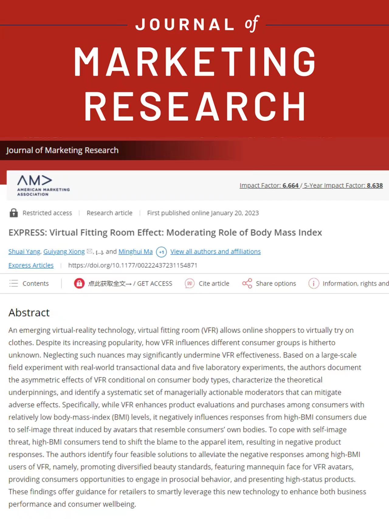 近日,我院工商管理系杨帅教授以第一作者身份在国际顶级学术期刊《Journal of Marketing Research》上发表了学术文章《EXPRESS: Virtual Fitting Room Effect: Moderating Role of Body Mass Index》(《虚拟试衣间效应:体重指数的调节作用》)。