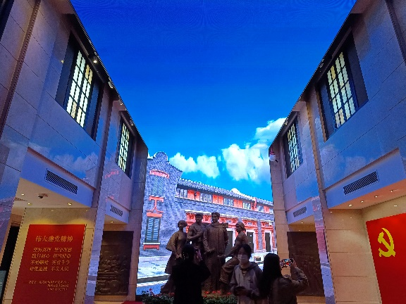 中共一大纪念馆这座兴业路上的石库门楼庄严肃穆。推开厚重的大门,犹如穿越回一百年前的上海,13名中共一大代表挺拔站立的群体铜像,拉开了伟大的开端——中国共产党创建历史陈列展览的大幕,包含序厅、前仆后继、救亡图存”,“民众觉醒、主义抉择”,“早期组织、星火初燃”,“开天辟地、日出东方”,“砥砺前行、光辉历程和尾厅7个板块,采用有年代感的文物实物、图片图表、油画雕塑、实景还原、多媒体声像等多种形式,生动展现了中国共产党诞生历程。