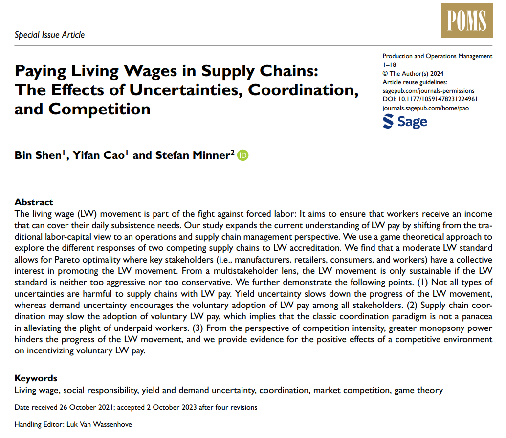 论文介绍:支付维生工资是通过解决低薪问题来打击强迫劳动的有效手段和重要策略。尽管公众社会责任意识的提高增加了企业改善工人待遇的压力,但学术界和业界专家仍未清晰地了解如何以自愿、协作、持久的方式维系企业的社会责任转型,是什么减缓了维生工资运动在现实中的进展,以及如何克服实践中遇到的阻力。该研究工作通过从传统的劳动力资本观点转向运营和供应链管理视角,揭示了通过维生工资支付达到多利益相关者(即制造商、零售商、消费者和生产工人)帕累托最优的关键条件,并进一步论证了供需不确定性、供应链协调和市场竞争强度对通过维生工资支付实现帕累托最优的影响。这些发现有助于发挥供应链管理在实现联合国可持续发展目标中的关键作用,为理解和推动维生工资支付提供了宝贵的视角和方法,使得企业和政策制定者可以更有效地设计和执行策略,通过优化供应链的运作提高生产效率并确保工人获得公正的报酬,最终实现社会公正和经济发展。