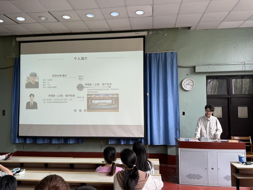 随后,旅游管理2023届校友赵浩翔分享了他在中青博联的工作经历,包括法拉利Tour项目、百胜RGM年会等。赵学长鼓励同学们在面对职场挑战时要保持积极的态度,并勇于探索不同的可能性,不仅传达了个人的成长历程,还通过生动的案例让在座的同学们对未来的职场生活充满期待。