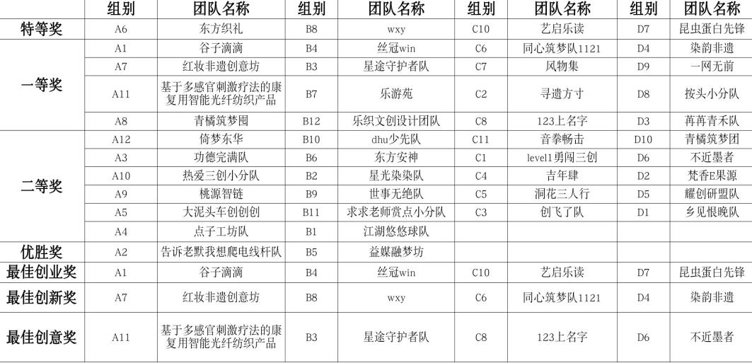 最终,“东方织礼”、“wxy”、“艺启乐读”和“昆虫蛋白先锋”团队斩获特等奖,本次比赛共评出一等奖16名,二等奖22名,优胜奖若干,另外还有“星途守护者队”、“红妆非遗创意坊”、“同心筑梦队1121”等队伍获得了单项奖的荣誉。