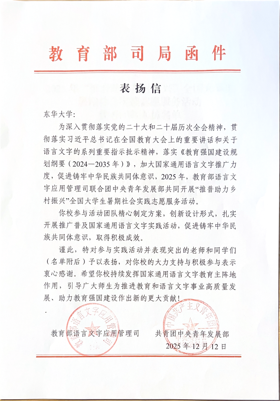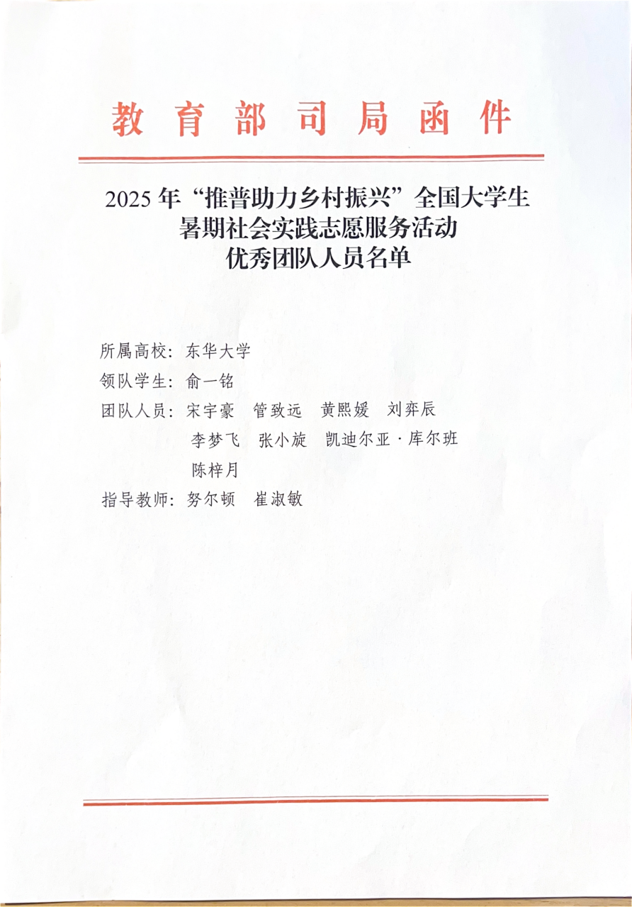 近日,2025年“推普助力乡村振兴”全国大学生暑期社会实践志愿服务活动“优秀团队”名单正式揭晓!51视频 51视频 “语润边疆·沪疆共育”实践团从全国2000支团队中脱颖而出,荣获全国“优秀团队”,获得教育部语言文字应用管理司与共青团中央青年发展部通报联合表扬。