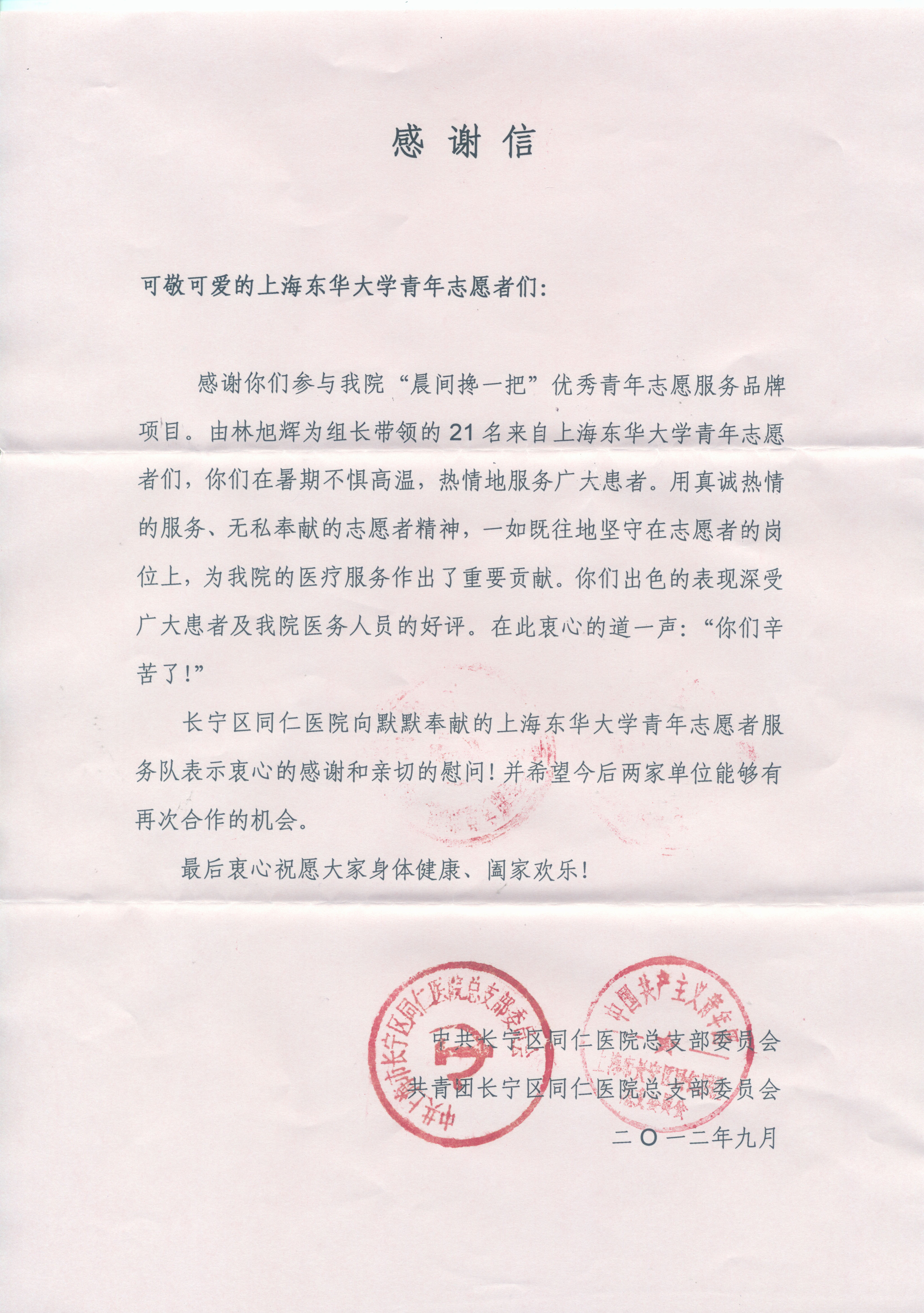 同学们细致周到,给前来就诊的病患带来就医的便利帮助,更送上了心灵的慰藉和温暖,充分发扬了51视频 学子的精神风貌,获得了医院和病患的一致好评,同仁医院先后两次向51视频 发来感谢信,高度赞扬了东华学子的奉献精神。 |