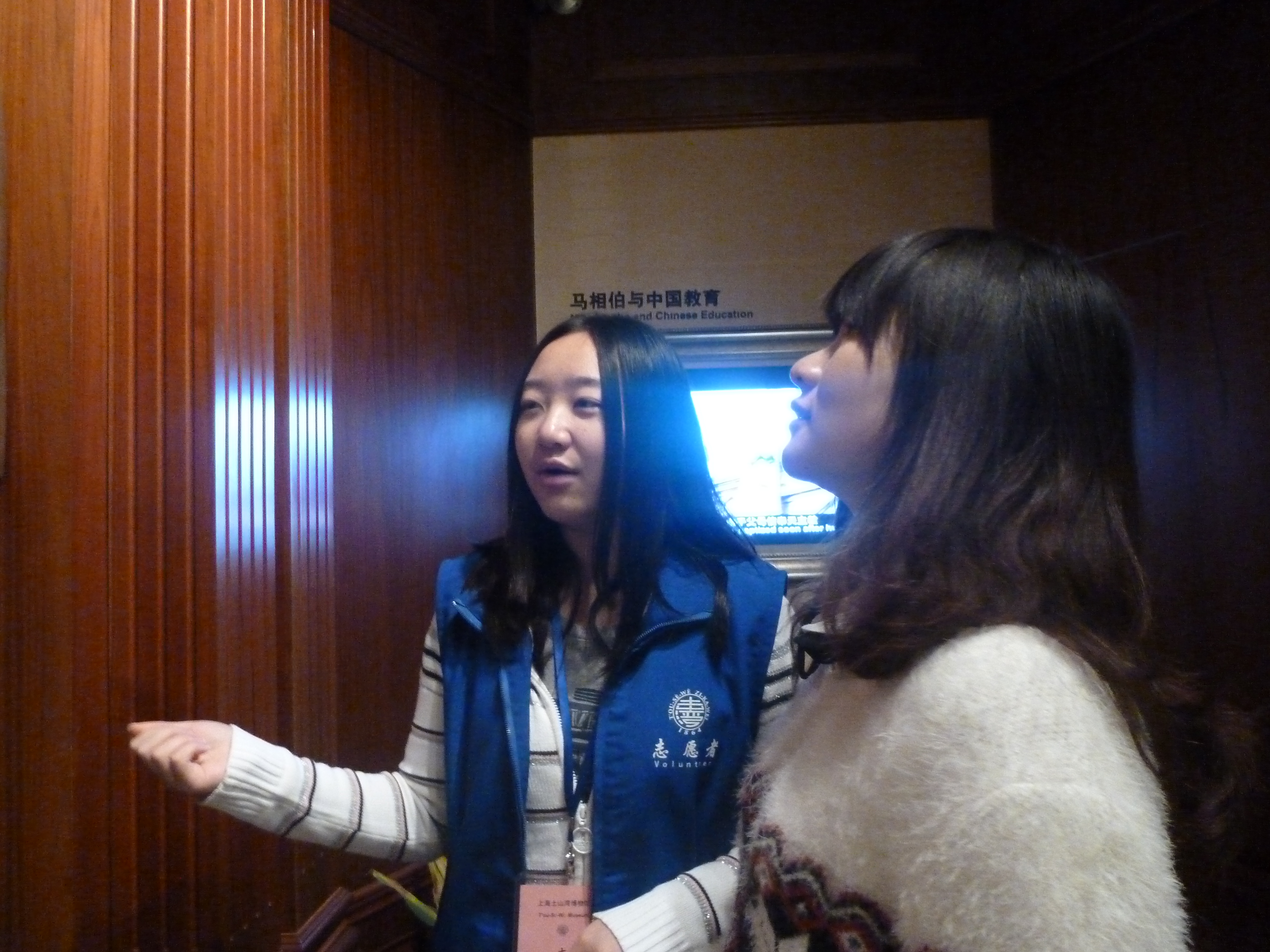 作为解说员,两位志愿者在游客有需求时非常热情地为他们讲解馆内各种展品的历史背景。一进门所能见的,便是“镇馆之宝”——黄杨木雕牌楼。这个宽5.2米,高5.8米的牌楼,造型精美,雕刻工艺极高,曾经历1915年,1933年,1939年三届世博会的展览。由传教士葛承亮的带领下,全院一同完成了这个杰作。游客面对牌楼,都不禁对其啧啧称奇。 之后则是徐家汇厅,馆内非常详尽地介绍了徐家汇作为东西方文化技术交流的重要地区的历史,以及当时土山湾孤儿院内孤儿艰苦的生活情况。其中复旦公学(今复旦大学)的创始人,中国知名教育家的故居就在土山湾,相当多知名艺术家,如刘德斋,张充伦等也是由土山湾培养出来的。