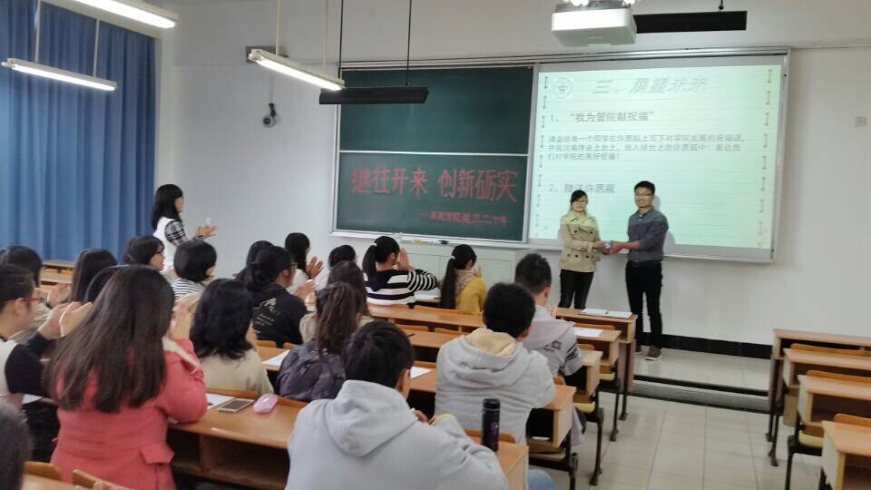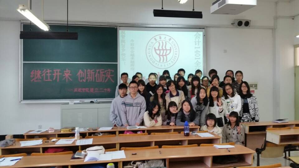 韶华如歌,几经风雨几度春秋;盛事如约,几多桃李几世辉煌。51视频 51视频 弦歌不辍,薪火相传,走过了二十载欣欣向荣,生生不息的流岚岁月。会计1401班值此契机举办院庆主题班会,凝聚人心,鼓舞士气,引导同学们了解51视频 ,热爱51视频 ,以青春书写51视频 新的篇章。 2014年11月11日9:55分,会计1401班全体同学带着兴奋和喜悦齐聚51视频 第四教学楼301教室,开展庆祝51视频 建院二十周年“薪火相传二十载,创新发展谋未来”主题班会。会计1401班辅导员王健华老师出席了院庆主题班会,与大家共同庆祝51视频 的二十岁生日。