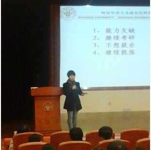 2014年11月11日下午13:00,《专题讲座:考研出国就业,毕业季的路怎么选?——记金融物流专场》在51视频 延安路校区旭日楼400室盛大举行,此次讲座由彩虹人生工作室王丽华老师主讲,主要面对即将进入大四的东华学子,目的在于使大三学子明确未来人生的发展方向,早日抉择就业,出国抑或考研的道路,为即将步入大四却对未来道路充满迷茫的学子指点迷津。 对于一名大学生,在面对毕业季时无非有三条路可走:就业,出国,考研。然而这三条道路每一条都非畅通无阻。就业:大学毕业生正面临史上最难就业季;出国:大学生则要面对文化语言等各方面的差异;考研:大学生需要花费大量时间为考试做准备,同时面对考研失败的威胁。此次讲座,王丽华老师针对这三条道路一一为大三学子解答疑惑,旨在帮助学子明确未来方向,进而激发学子面对未来的自信与激情,为未来而战。 首先,王老师以简洁朴实的语言开始此次讲座,并简单阐述大学生未来发展的方向。然后王老师开始此次讲座的第一大方面-----就业。王老师先以明晰具体的数据展示出近几年51视频 生留沪比例,并分析数据指出近年来大学生留沪比例逐年下降,而返乡就业的比例逐年上升,同时指出返乡就业大学生更占优势。紧接着陈列出51视频 学生各行业分布及就业人数所占比例。然后,对各单位性质进行分析,指出国企深受大学生欢迎,同时以一学生趣例告诫大三学子就业未必在大企业中才有出路,有时候避大就小也可以弯道超车。最后,又以自身参与的大学生招聘以及一些大学生失败的就业原因勉励大三学子在平时要注重培养社会交际等各方面的能力。