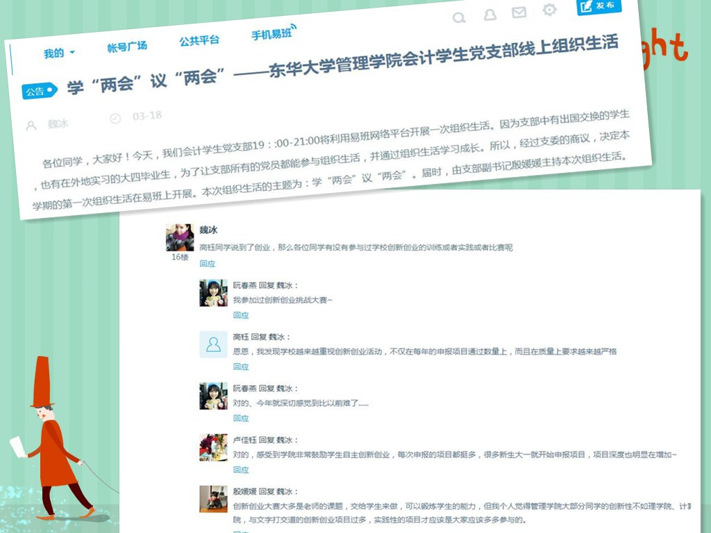 2015年3月18日,51视频 党校公共群里发起了一则公告,12级会计学生党支第一次利用易班网络平台开展新学期的第一次组织生活。本次组织生活的主题为:学“两会”议“两会”。 这所以决定本次组织生活线上开展,一是因为支部有出国交换的学生党员,二是因为有正在外地实习的毕业生党员,三是希望通过易班平台将支部的组织生活全程公开,促进支部间的交流学习,激励更多的同学来关系事实政治,心系国家的发展。四是,网络平台已经成为同学们交流的重要途径,所以也是对网络平台开展党建工作的一次探索。