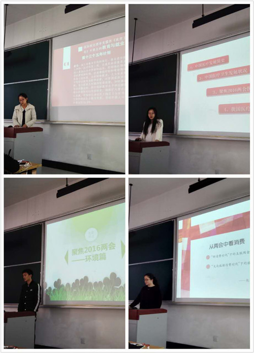 首先主持人王梦竹同志向大家简单介绍了活动目的及活动议程。接着,四个学习小组依次派代表上台就他们关注和学习的两会问题同大家进行分享。