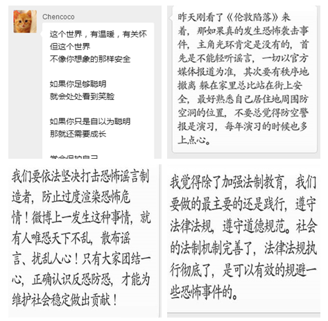 为进一步加强法制宣传,教育和引导大家养成学法、懂法、依法办事的良好习惯,会经1401班、旅游1401班、旅游1501班及会经1501班以学习《中华人民共和国刑法修正案(九)》和《中华人民共和国反恐怖主义法》等相关法律法规为重点,于4月14日召开了联合主题线上班会。 班会首先结合近期发生的恐怖袭击活动展开讨论,又结合所见所闻对身边曾发生的真实突发情况做出分析。所列问题涉及同学人身安全,重点强调了恐怖袭击的严重性和突发性。引起同学们的重视,并让同学们懂得了对抗恐怖主义是每个人的责任与义务。而后,各班班长向有重点的科普、介绍了《中华人民共和国刑法修正案(九)》和《中华人民共和国反恐怖主义法》等相关法律法规。并让同学们进行深入讨论,和日常生活相结合,做到让大家知法懂法。然后,每班同学自编了一些笑话和段子,让班会保持在轻松的气氛下,使同学们在得到欢娱的同时对平时易出现的不安全因素有了更深刻的理解与认识。