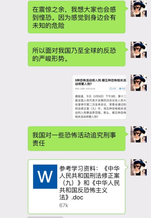 通过大家的积极发言可以看出,大近年来国内发生的暴力恐怖事件受到了广泛的关注在听到类似事件的发生时,我们首先感到的是震惊,以及恐慌,所以面对严峻的反恐形势,我国将一些恐怖活动列入了刑法的追责范围,之后班级同学一同阅读了《中华人民共和国刑法修正案(九)》和《中华人民共和国反恐怖主义法》中的相关内容。