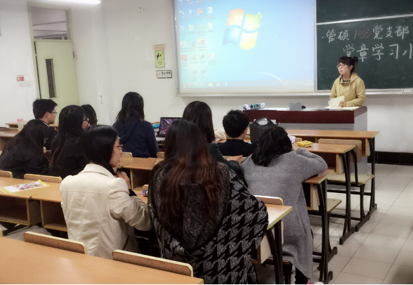 管硕153党支部的活动内容围绕党章学习进行了入党积极分子的学习汇报,感动中国人物精神的学习交流。积极分子们对党徽党旗、党的纪律、党的组织制度等内容进行了学习汇报,并将学习党章过程中留下的疑问与收获的心得与大家进行了分享。管硕151党支部则围绕习党的十八大会议精神等内容开展了本次活动。支部副书记张雪颖给所有组员简单温习了党章的主要内容和历史沿革,她以“一大”到“十七大”为主线,带领同学们再一次了解了党章党史的发展过程;随后,她又带领同学们重点学习了“十八大”确立的新党章。