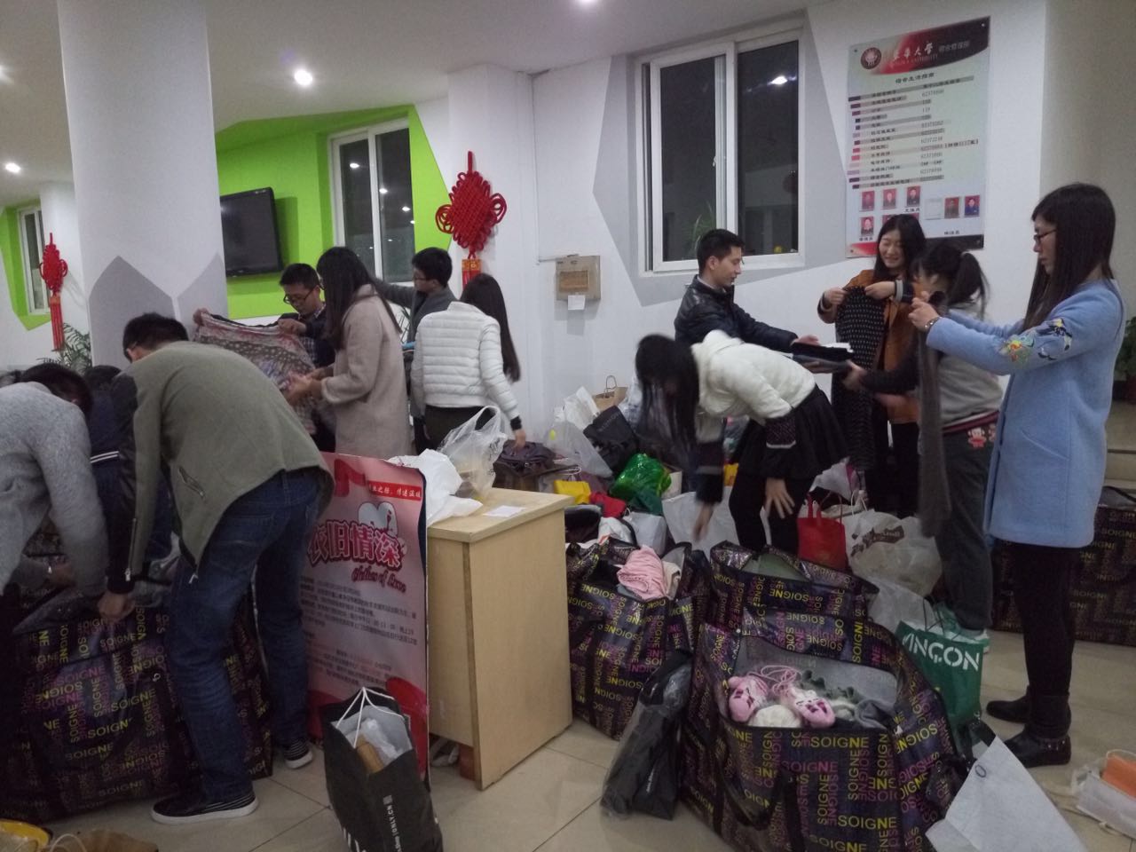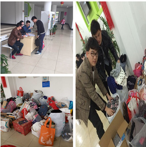 一件旧衣,一份爱心。自3月18日起,捐赠活动得到了广大老师和同学们的积极响应。负责沟通联系的同学第一天就收到了许多捐赠短信的“轰炸”,即将毕业的2016届学姐学长们纷纷询问旧衣的捐赠方式,将自己的闲置衣物、书籍等物品进行捐赠,奉献爱心;有些学长学姐因为工作原因不能亲自将衣物送到收纳处,更会向15级党员同学预约时间,由15级党员同学上门领取。同时,负责收集旧衣物的各位党员同学也积极行动起来。活动期间,他们在12宿大厅里设置捐赠点,向过往的同学宣传活动的内容与意义,认真登记捐赠人的信息;并将同学们捐赠的衣物贴上标签,进行细致分类。
