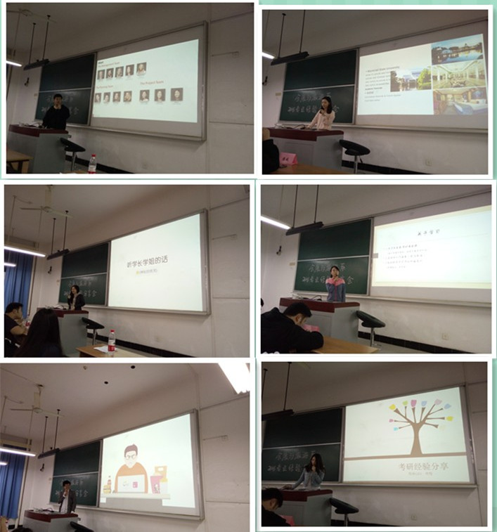 主持人王梦竹同学首先向大家简单介绍了到场进行经验分享的学长学姐们,他们在繁忙的工作和紧张的论文中拨冗前来,为学弟学妹们指点迷津,在座的同学都十分期待。