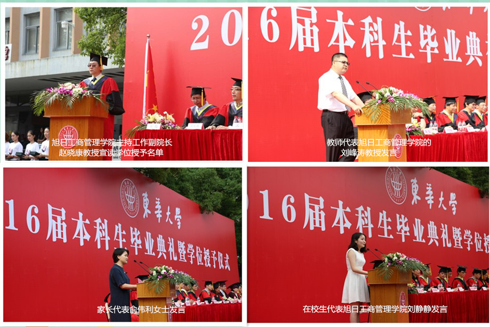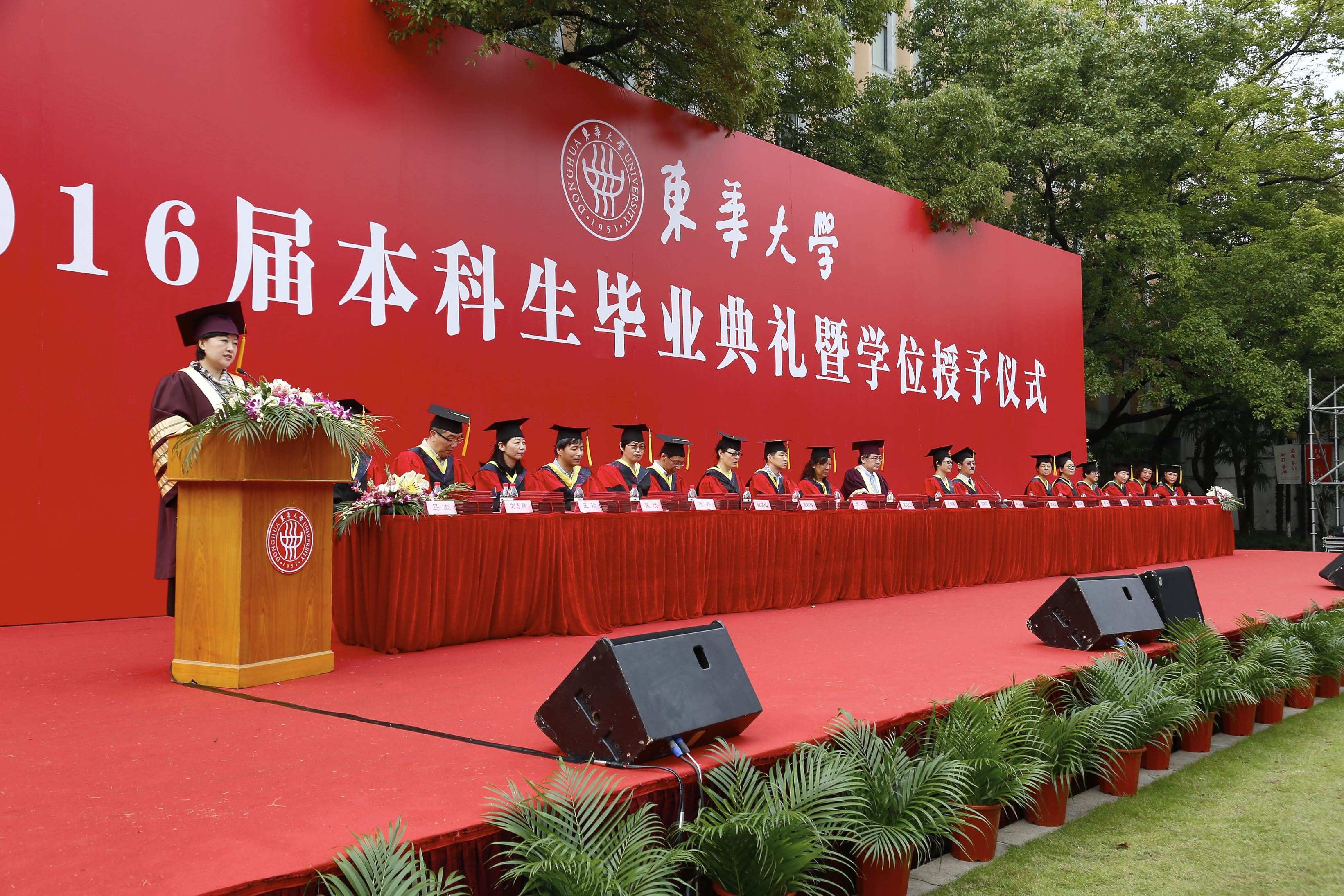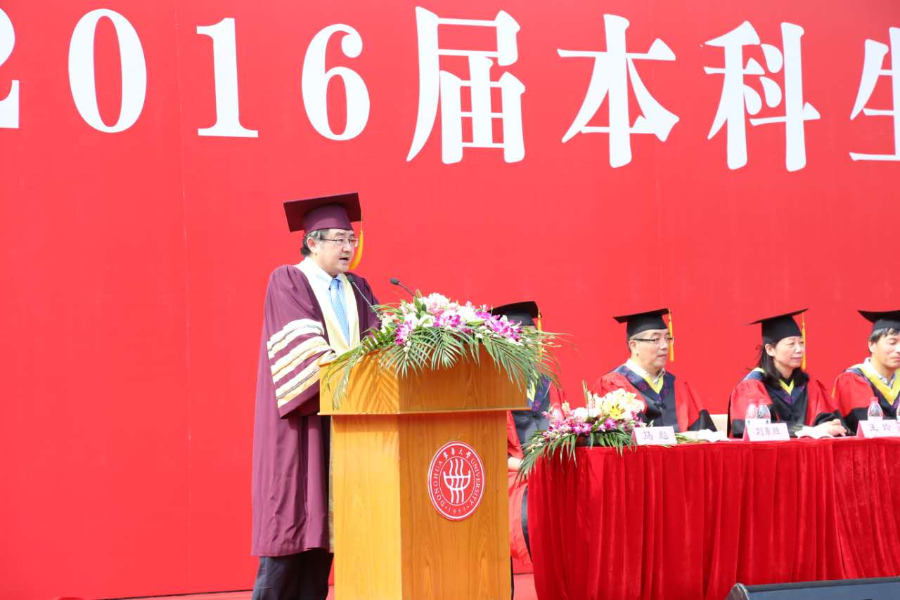 长期以来的创新人才培养的成绩表示肯定及鼓励。并进一步指出东华学子应以中华民族伟大复兴为己任,坚信我们的毕业生能承载着国家和学校的期望,发挥所长、奉献社会、建功立业。在送给毕业生的四字寄语中,蒋校长提到古人所说“得其大者兼其小”,引出对毕业生在“志”方面要立志高远,持之以恒的要求;通过对李克强总理“大众创业,万众创新”的解读,鼓励毕业生在“众”方面做好万众之一、服务社会、实现人生价值;引用韩愈的名言“业精于勤荒于嬉,行成于思毁于随”激励毕业生们在“勤”方面勤于思考,勤于实践;在“学”方面,期望毕业生能保持求知的欲望,谦逊好学,丰富内涵。最后表达了对东华学子传承东华文化的期盼并为现场所有毕业生送上毕业祝福。