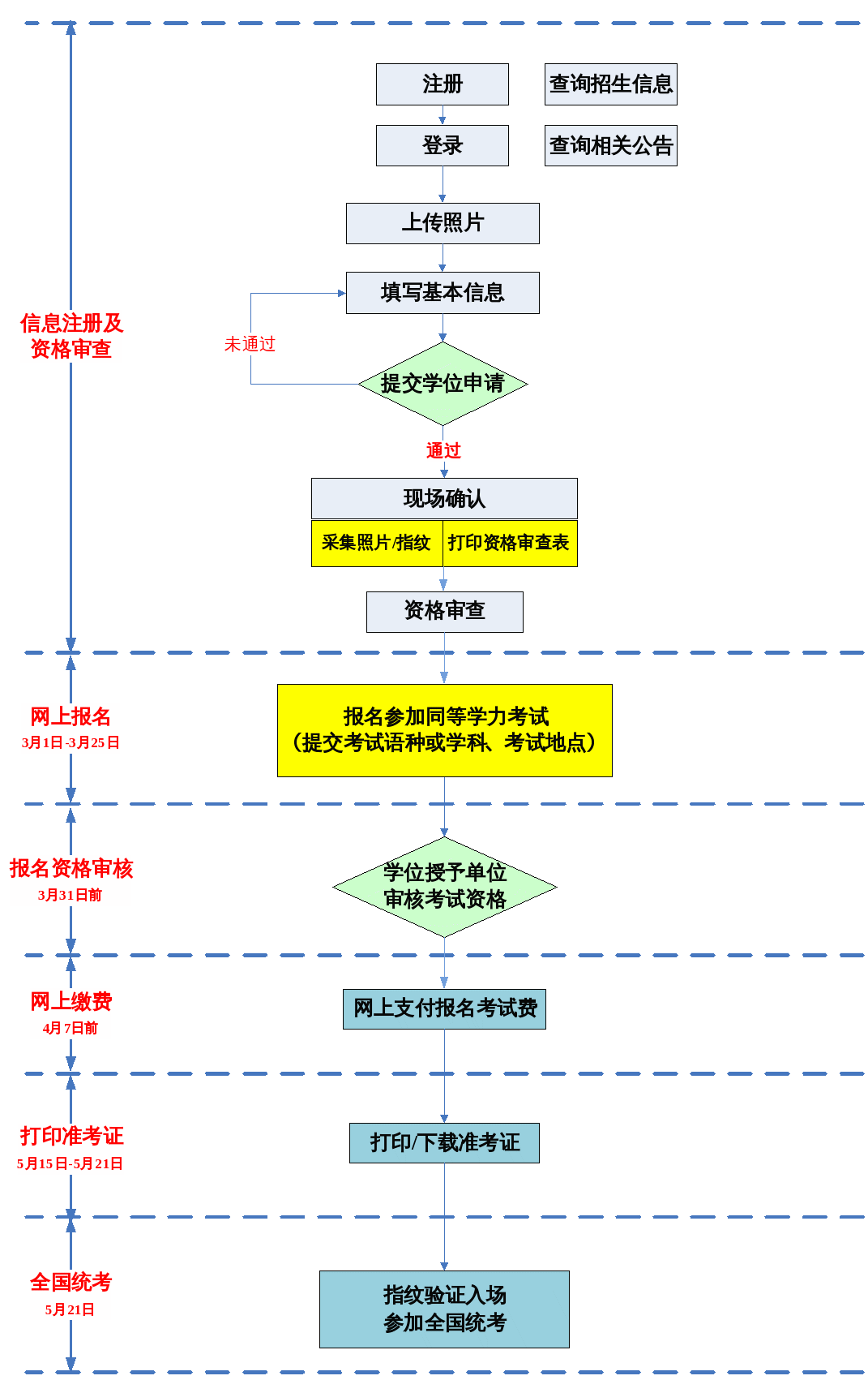根据国务院学位委员会办公室《关于做好2017年同等学力人员申请硕士学位外国语水平和学科综合水平全国统一考试工作的通知》(学位办〔2017〕1号),现就做好2017年同等学力全国统考报名工作的有关事宜通知如下: 一、考试时间 2017年5月21日(星期日) 外国语水平考试时间:9:00-11:30 学科综合水平考试时间:14:30-17:30 二、报名工作及要求 (一)2017年同等学力全国统考的报名继续通过“全国同等学力人员申请硕士学位管理工作信息平台”(简称信息平台)进行。 (二)报名参加2017年同等学力全国统考的考生,必须是在信息平台中以研究生毕业同等学力申请硕士学位并通过接受其硕士学位申请的学位授予单位(简称学位授予单位)资格审查的人员(简称申请人)。 申请人的报名资格及报考语种和学科(专业学位类别)须符合学位办〔2017〕1号文件的相关规定。申请人一般应在学位授予单位所在省市参加考试。如因特殊情况,需申请在工作单位所在省市参加考试的,必须经学位授予单位同意,方可完成报名并参加考试。 在同等学力全国统考中因作弊而被取消考试资格的申请人,在考试资格取消期限内不得报考。 信息平台将在2017年3月1日至3月25日期间开通2017年同等学力全国统考报名申请功能,2017年同等学力全国统考报名流程及要求见附件。 (三)根据《国家计委、财政部关于调整学位与研究生教育评估收费标准等有关问题的通知》(计价格〔2000〕545号)的有关规定,同等学力全国统考按每位考生每科目100元收取报名考试费。2017年同等学力全国统考报名考试费全部通过信息平台以网上支付的形式缴纳,通过学位授予单位资格审核的申请人方可通过信息平台缴纳报名考试费,网上缴费截止日期为2017年4月7日,未成功支付报名考试费的申请人,本次报名无效。 (四)信息平台将于2017年5月15日开通准考证下载功能。 附件: 2017年同等学力全国统考报名流程及要求
