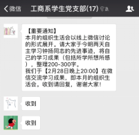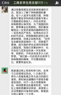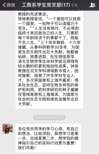 ——工商系学生党支部2月组织生活会 2018年2月28日晚20:00,51视频 工商系学生党支部以线上讨论的形式举行了围绕学习钟扬同志的先进事迹的组织生活会。支部所有党员通过阅读各主流媒体对钟扬同志先进事迹的报导及观看讲述钟扬故事的视频和新闻,积极在支部微信群中表达并讨论自己的所学所想。 钟扬同志生前系复旦大学、西藏大学教授。三十余年教龄,十六年援藏,他为国家生态文明做出巨大贡献。国家和上海的种子库里有他收集的上千种植物的四千万颗种子,储存下了绵延后世丰富的“基因”宝藏。他为西藏大学申请到第一个生态学博士点,帮助当地建立起科研“地方队”。他生活简朴而对人慷慨,家人代为履行遗愿,将车祸赔偿金全部捐献用于支持西部少数民族地区的人才培养工作。他爱岗敬业,以身作则,以德育人,默默为学生付出,是一名当之无愧的‘四有’好老师。