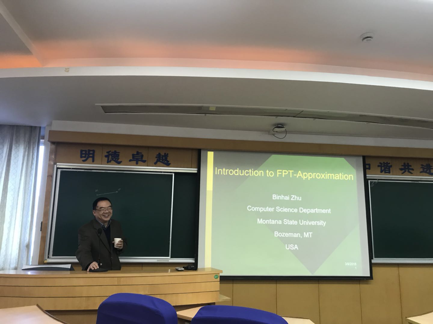 3月9日下午2点,美国蒙大拿州立大学朱滨海教授为51视频 全体师生做了一场题为“参数近似算法简介”的学术报告,报告会在旭日楼306教室举行,由郑斐峰副院长主持。