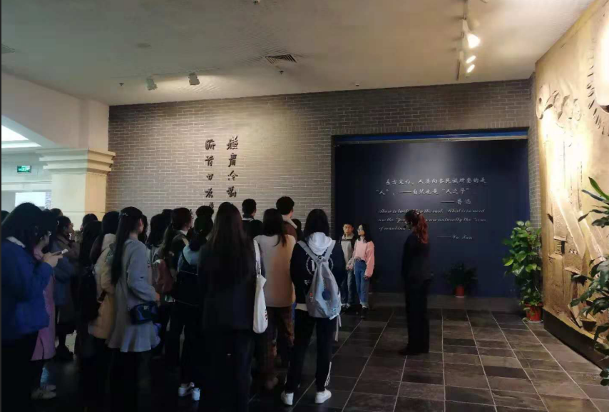 学员们首先来到的是序厅,正对着大家的是以鲁迅先生的两部作品《彷徨》和《呐喊》为基本元素创作的浮雕,左手边的墙上是鲁迅的名句“横眉冷对千夫指,俯首甘为孺子牛”,右边墙上有臧克家为纪念鲁迅而写的《有的人》。还未进入正式的展厅,学员们就已经感受到了鲁迅先生的风骨和人格魅力。