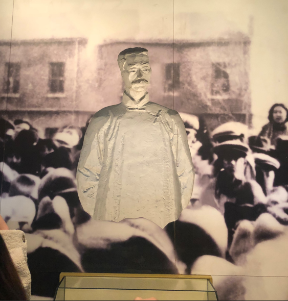 第一个展厅“生命之路”呈现的是一个短片,浓缩了鲁迅在与黑暗世界的斗争中,披荆斩棘,艰难跋涉,奋然前行的光辉一生。紧接着的第二展厅“首在立人”中的一个特别的雕塑引起了所有学员的注意,经过讲解员的讲解,大家知道了这是一个阴雕作品,或者说是凹面雕塑,从不同角度都可以看到鲁迅先生正对着大家,就像是在拷问每一个人的灵魂。这一个展区主要是在传达鲁迅先生“立人”的核心思想,学员们身处其中,反思自己是否具备了独立、健康、强壮的人格。