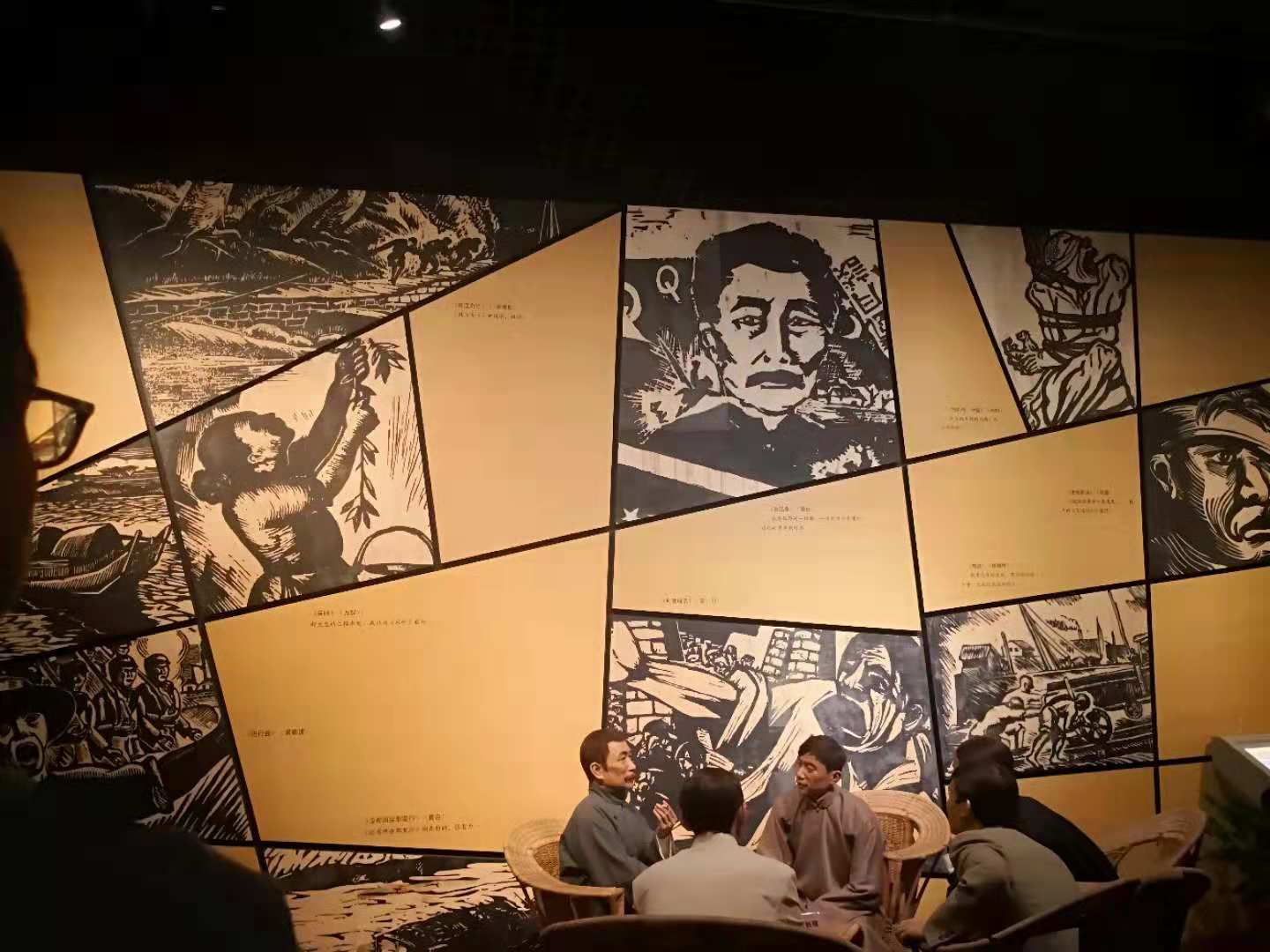 继续向前,大家来到了第三展厅“画出国人的魂灵”,看到了鲁迅笔下人物的沙画、非常珍贵的《故事新编》手稿和先生一直用以写作的“金不换”毛笔。鲁迅先生说过:“我并无大刀,只有一枝笔,名曰‘金不换’。”学员们仿佛置身于先生写作的现场,为其饱蘸激情用一支笔对敌斗争的精神而感动。 第四展厅为学员介绍的是鲁迅先生除文学之外对中华文化艺术所做的保存、开拓和建设。最吸引学员眼球的是展厅右侧栩栩如生的蜡像,描绘的是鲁迅1936年在上海八仙桥参加木刻交流会的场景,鲁迅先生希望中国青年能够学习各种中国古老传统的技艺,融合西方艺术文化的长处,发扬传承这些技艺。另外,展区内还为学员们还原了鲁迅先生经常出入的内山书店的场景,他在里面会进行很多的学术研讨会,让大家感受到了浓郁的学术氛围。学员们在“保存者、开拓者、建设者”这一展区中还通过一幅幅照片和讲解员的讲解完整了解了鲁迅先生的一生,包括他幼年的经历、弃医从文的经过和用笔对抗封建社会、唤醒人民的过程。学员们沉浸在鲁迅先生一生经历的讲解中,心中充斥着敬佩之情,为那时的民情而悲痛,为前人的努力而感叹。