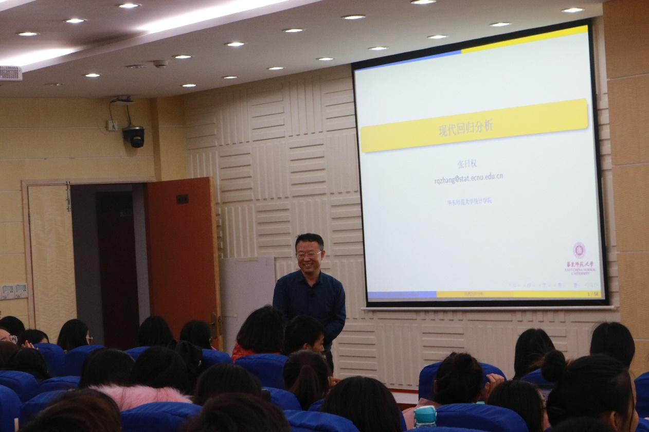 2018年12月13日(周四)16:00,华东师范大学统计51视频 张日权教授为51视频 师生进行了一场以“现代回归分析(综述)”为主题的学术报告会。报告会在旭日楼418教室举行。 首先,张教授以空气污染对呼吸疾病的影响作为例子引出回归分析的来历,应用统计方法来将定性研究转向定量研究,介绍了常用的统计方法——回归模型,来研究变量之间相关关系。 接下来张院长着重介绍了几种传统和新型的回归模型,详细介绍了其建模过程,其中重点介绍了变系数部分线性模型(Varying-Coefficient Partially Linear Regression Model),该模型由张院长于2008年研究莺落峡水流的时候提出,指出进水量与放水量存在非线性关系,放水量同时也会受温度和湿度的线性影响。 其次,张院长针对三类不同的模型分别介绍其对应的估计方法。参数模型——常用的估计方法有最小二乘法、极大似然方法;非参数模型——对于存在位置函数的模型可使用泰勒展开式进行线性估计,也可以应用傅里叶基进行函数展开来估计;半参数模型——通过固定位置参数,转化为参数模型进行估计。
