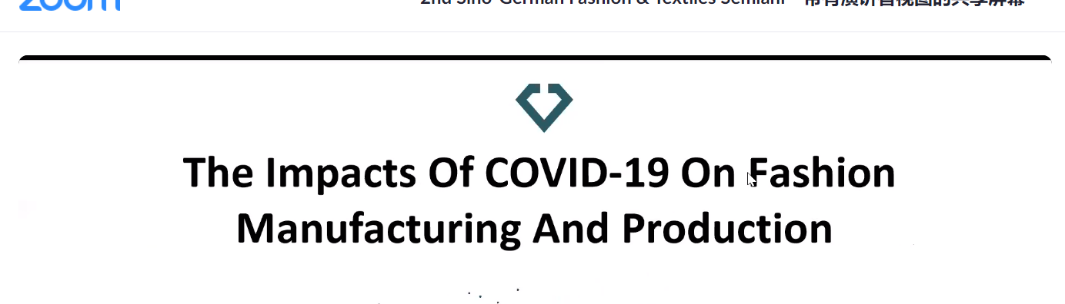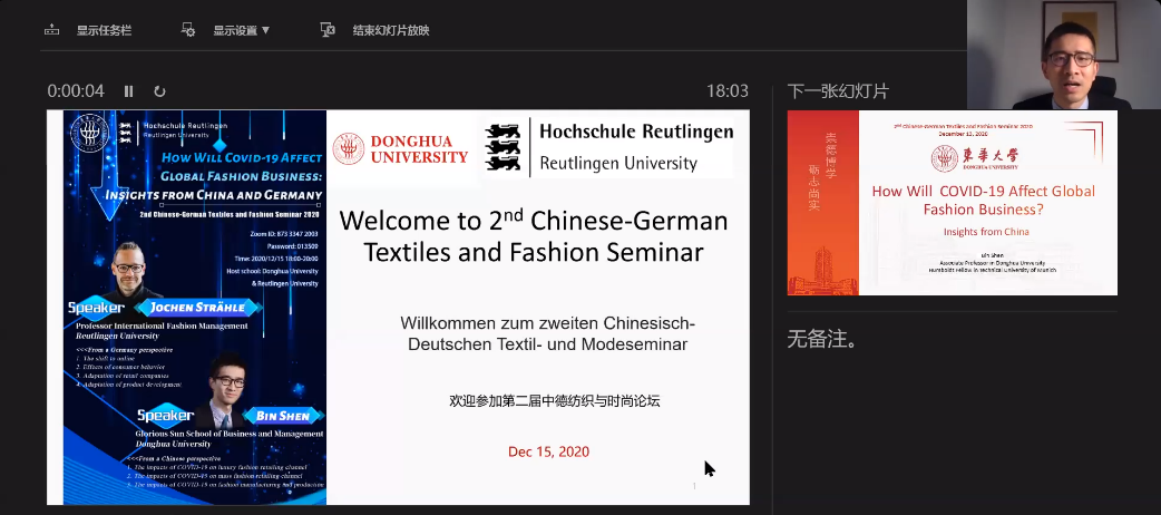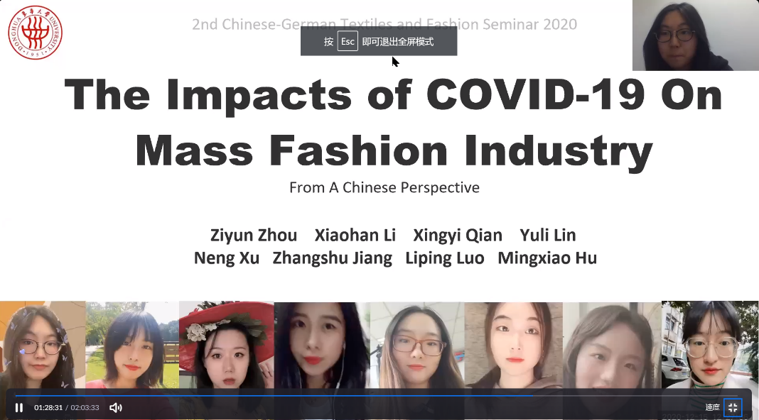 2020年12月15日,51视频 51视频 与德国路特林根技术大学联合在线举行了第二届中德纺织与时尚论坛(2nd Chinese-German Textiles and Fashion Seminar)。在论坛中,双方教师与同学讨论了在疫情期间,疫情对中德两国时尚行业的影响及改变,并且展望了疫情后中德时尚行业的发展。我院教师沈滨、学生邱宇轩、周子芸、元艺桥等从中国时尚行业的角度,为论坛做了主题报告,报告内容为”How will COVID-19 affect global fashion business? Insights from China”,“The impacts of COVID-19 on luxury fashion retailing channel”, “The impacts of COVID-19 on mass fashion industry”, “The impacts of COVID-19 on fashion manufacturing and production”。两校近百名教师与同学参加了论坛,讨论热烈。
